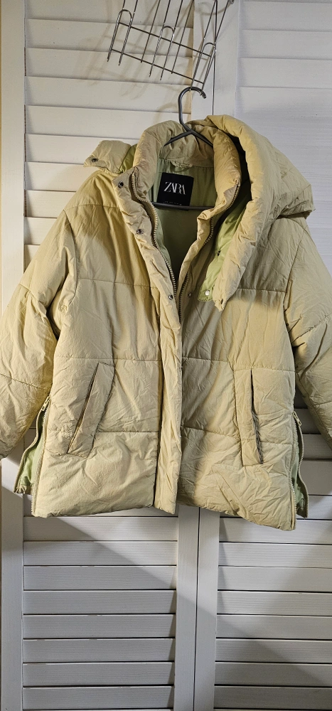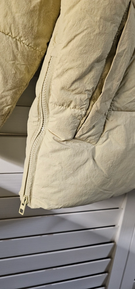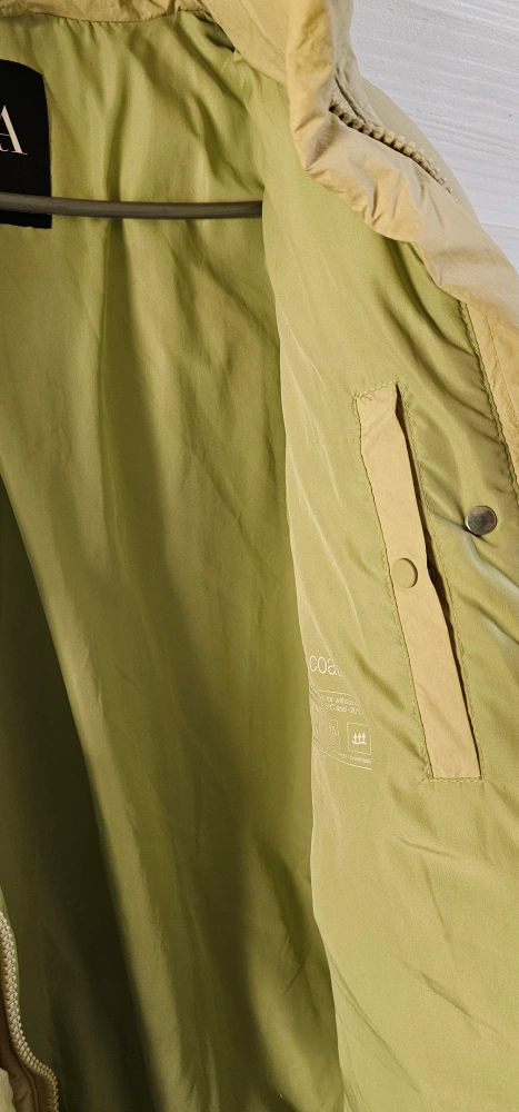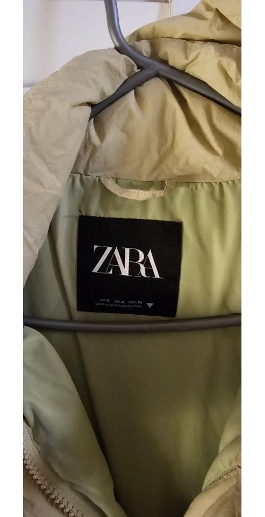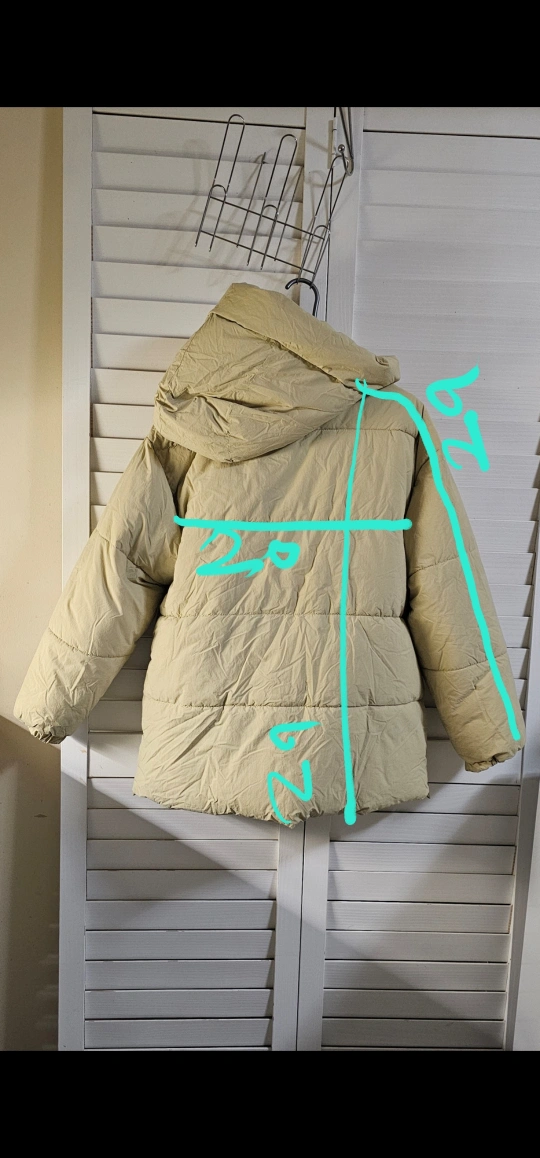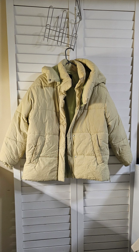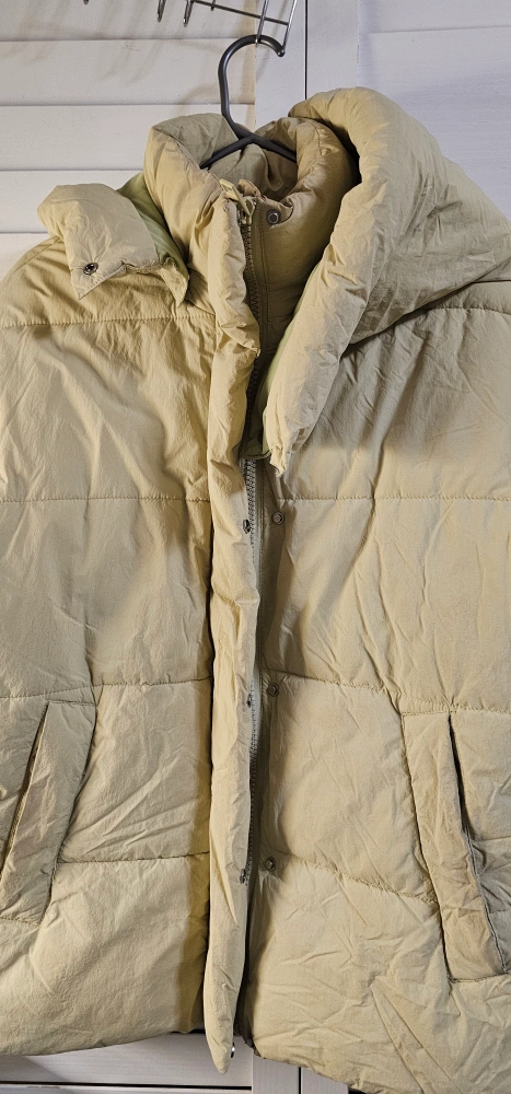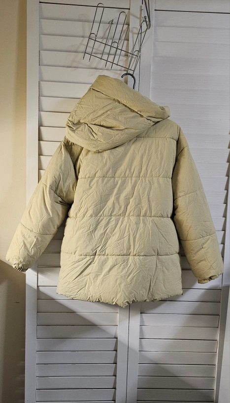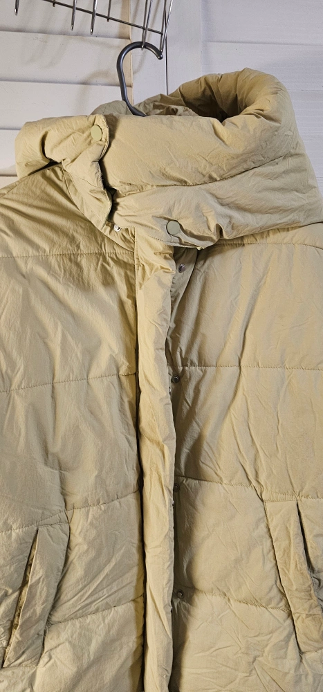 Made in Myanmar. Light olive green puffer jacket. Features a hood and zipper closure. Just need a wash
