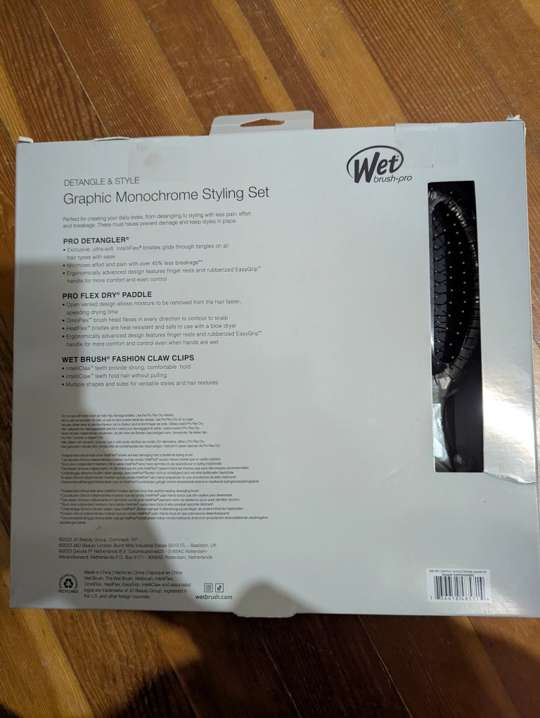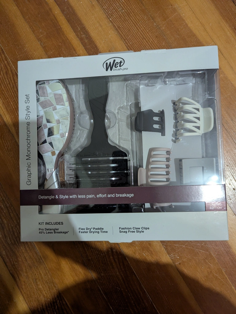 New Wet Brush Pro styling set. Includes paddle brush, claw clips, and detangler. Detangles and styles with less pain, effort, and breakage. 45% less breakage.