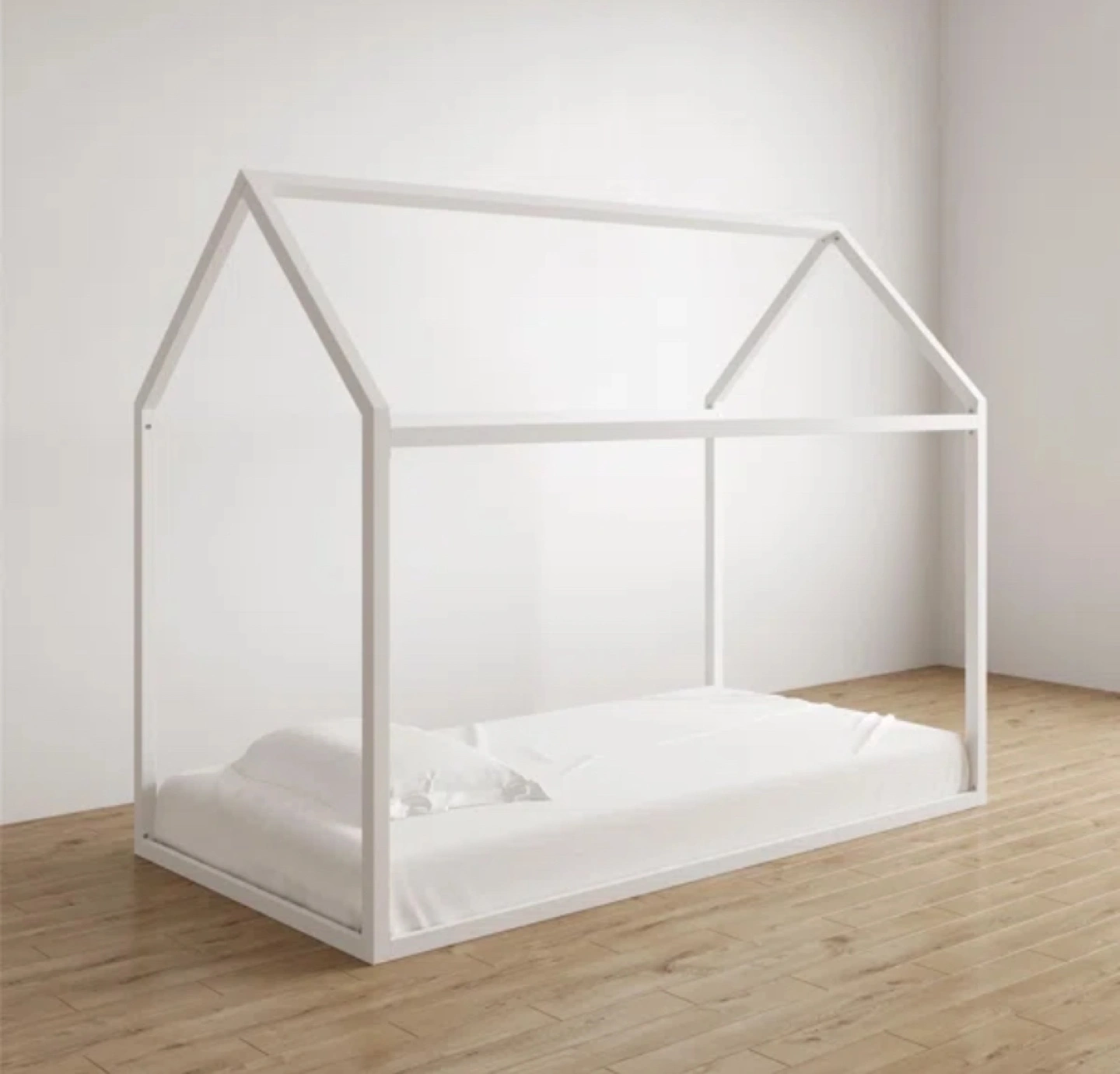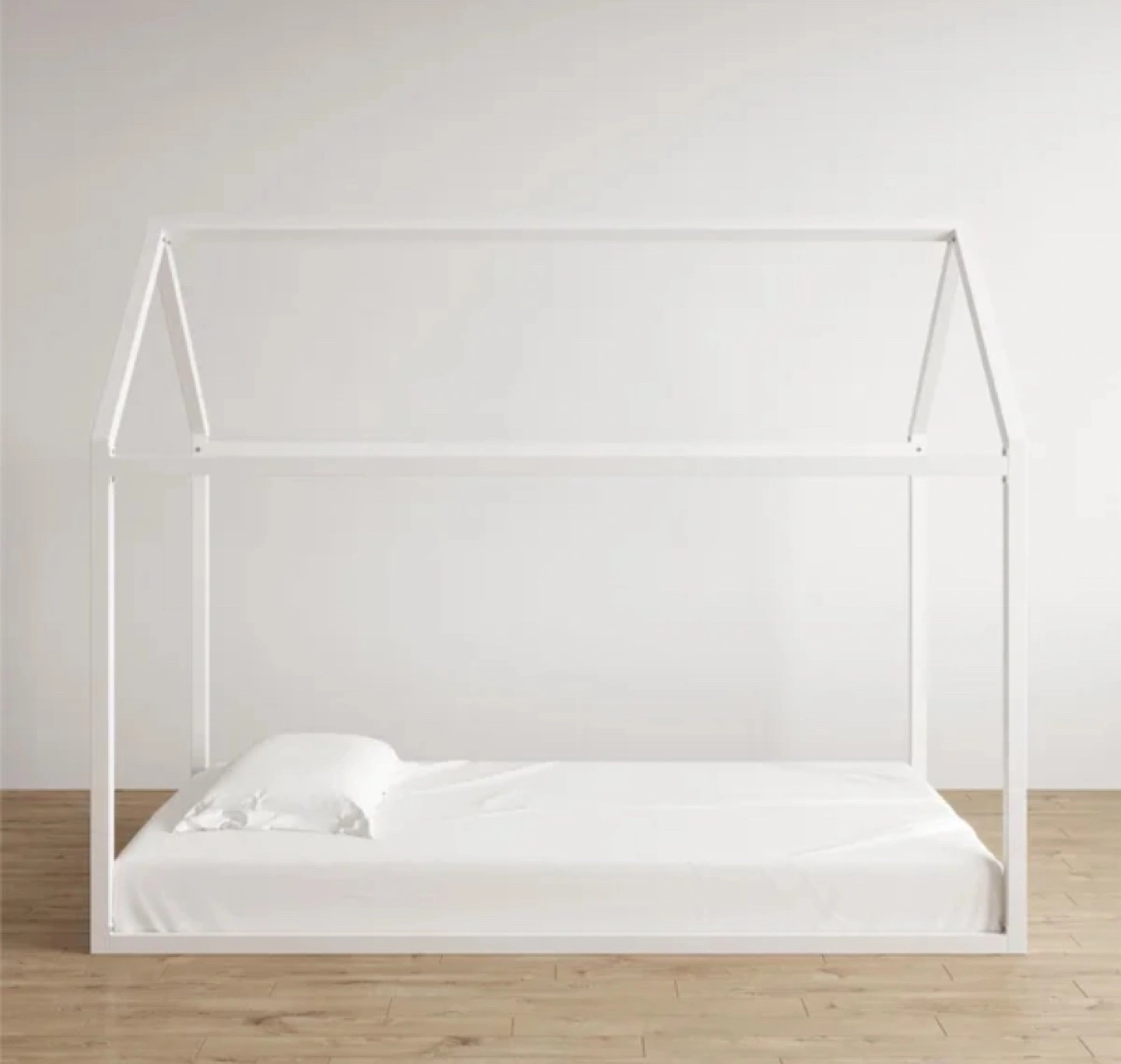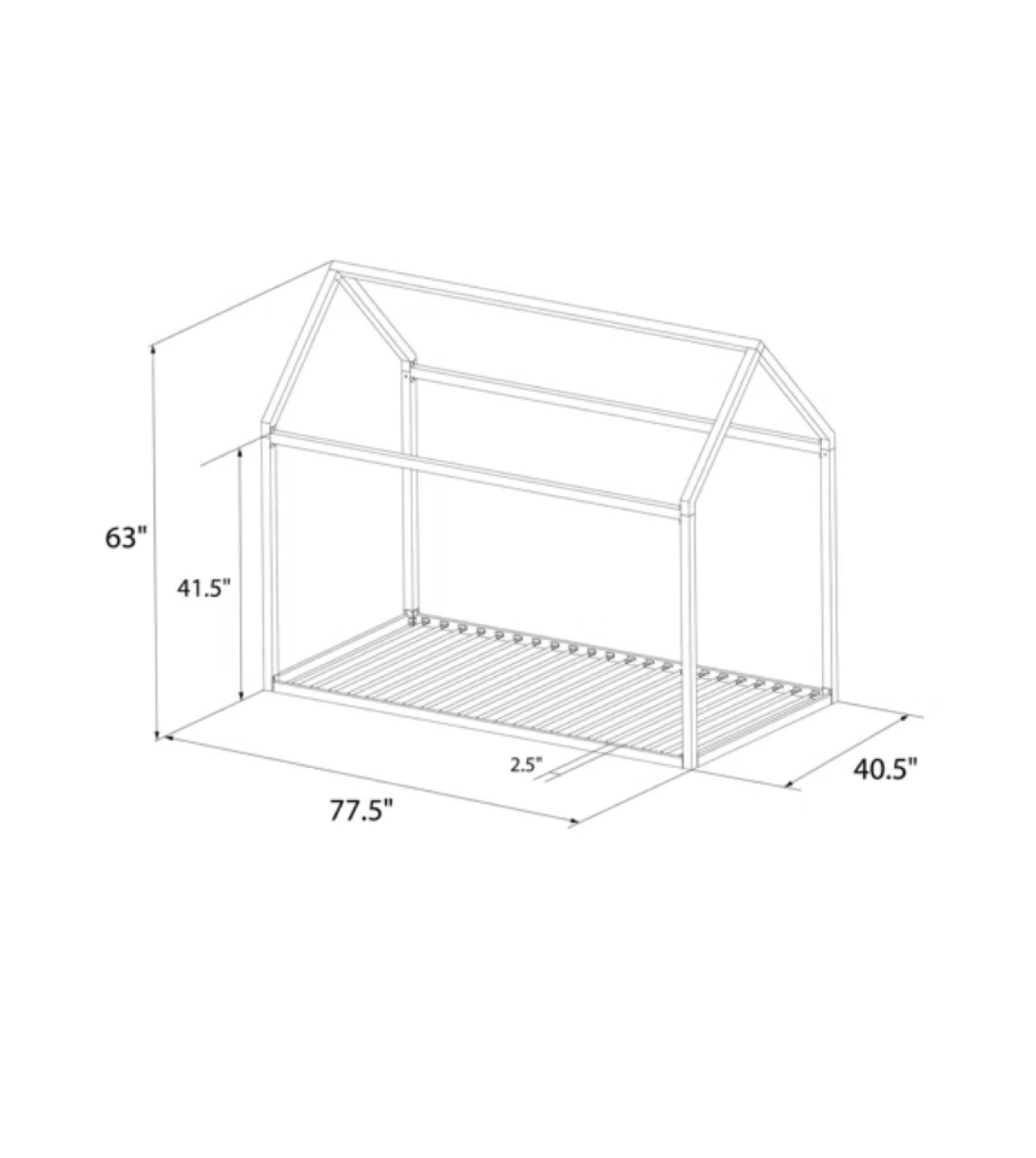 With its sturdy metal frame and safe low profile, this kids' twin floor bed is easy for children to climb in and out of while the canopy frame offers multiple design ideas for you and a fun, imaginative space for your child's sleep and playtime. The House Floor Bed offers metal slats for mattress support, no box springs required, and accommodates a standard-size twin mattress, sold separately.