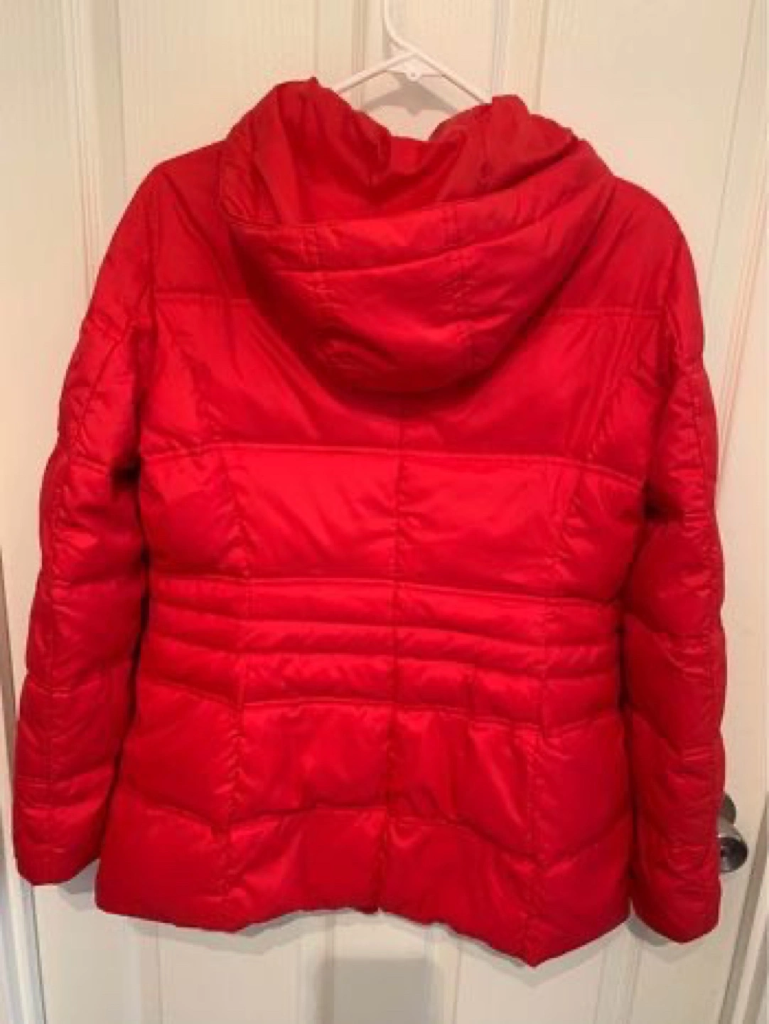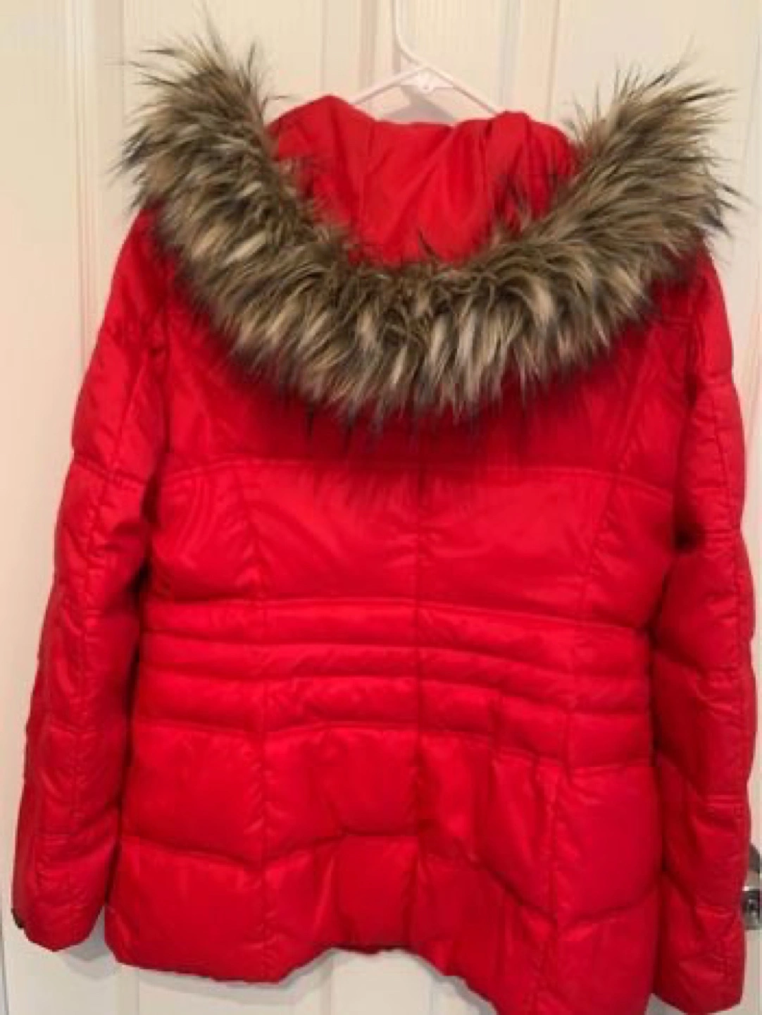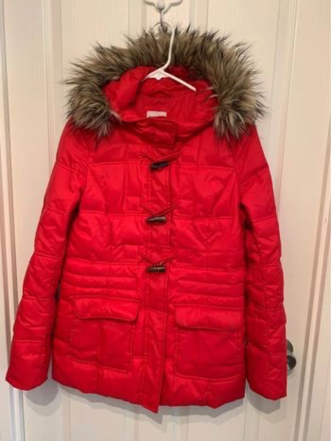 Elegant Women's red puffer jacket. Features a faux fur trimmed hood and toggle closures. Long sleeves and pockets. Used for a few times only. Selling it as I gained weight . Removable fur. Size- Medium. Comes from smoke free and pet free home. Pick up at Bathust and Steeles area.