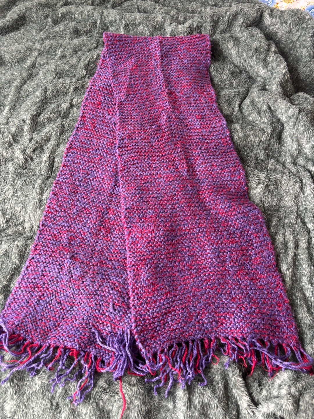 Lovely hand-knitted scarf. Features a purple and pink colour scheme. Finished with a fringe. Soft and very warm.