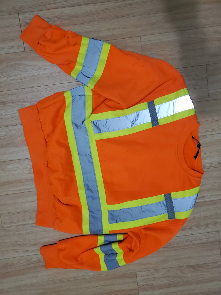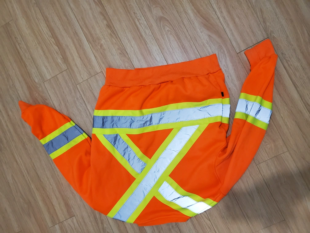 Bright orange sweatshirt with reflective safety stripes. Long sleeves, crew neck. Good for work or casual wear. Shows some wear. good for construction or roadwork or hydro