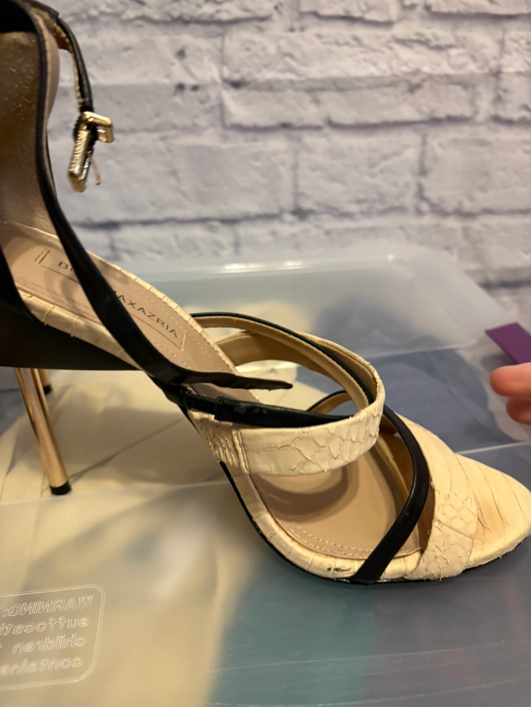 Beautiful BCBGMAXAZRIA heels. Ankle strap sandals. Gold stiletto heels. Cream and black snakeskin pattern. Size 9, overall great condition, some signs of light wear. Pick up only, retail was over $250 USD.