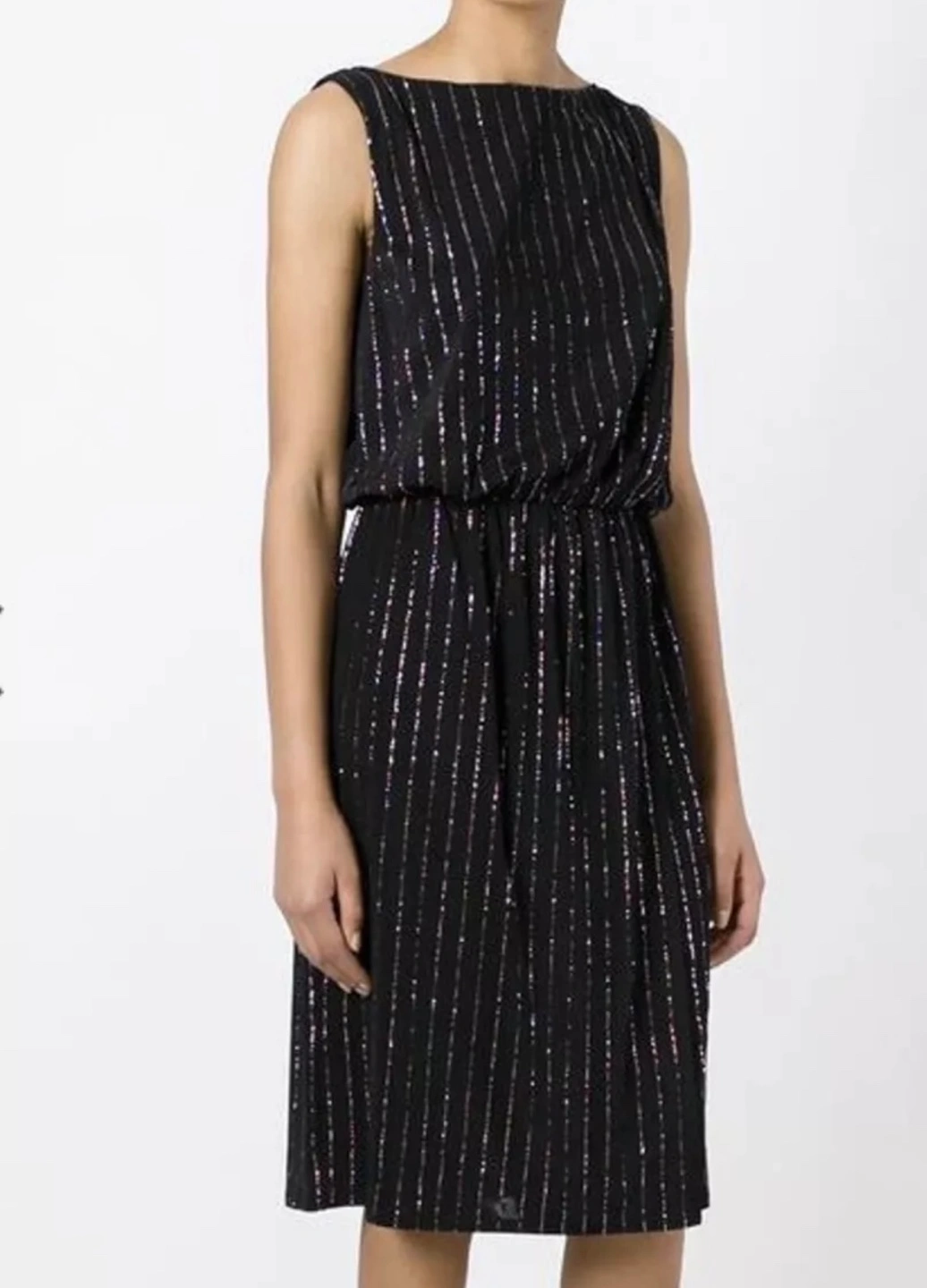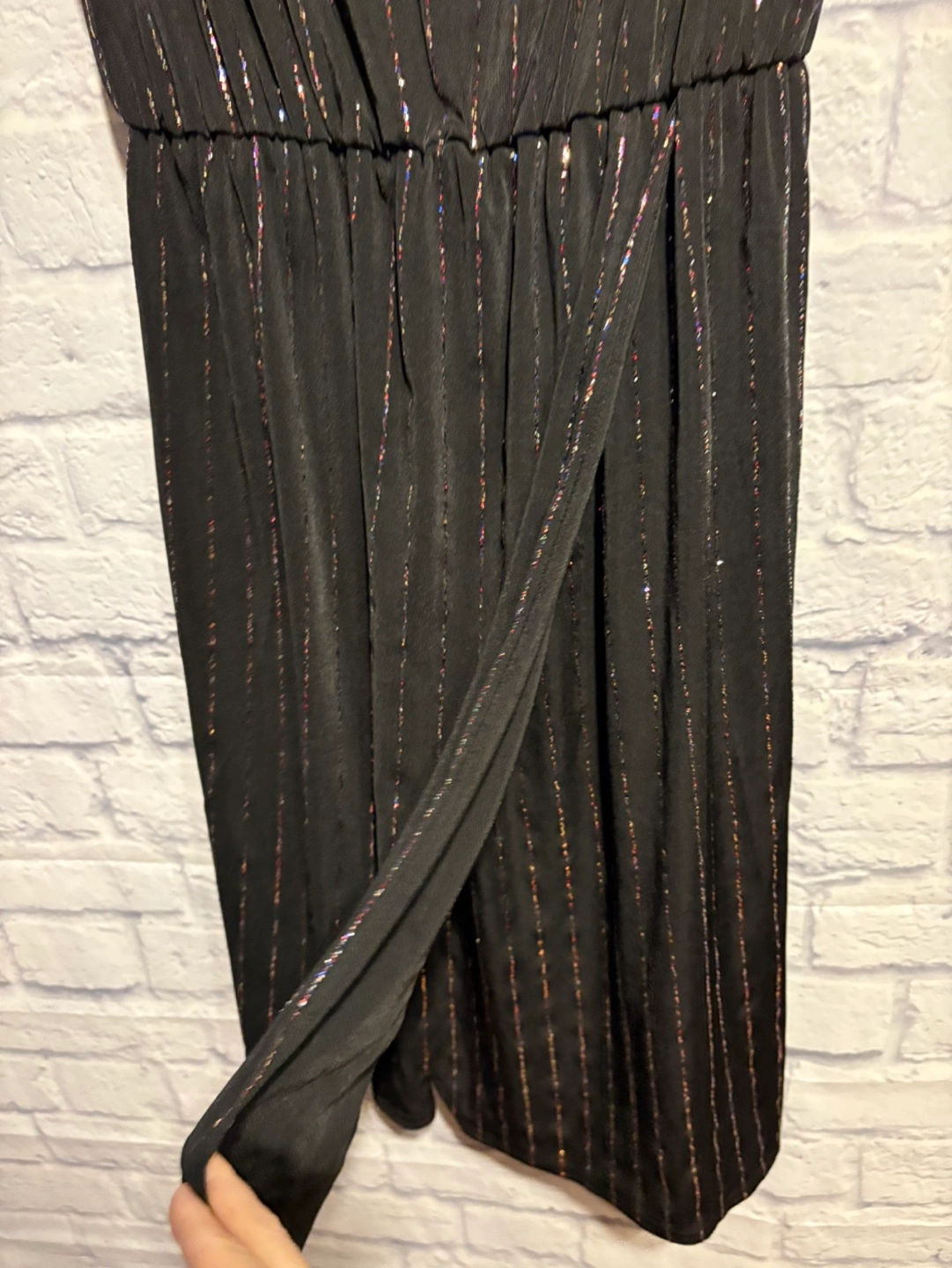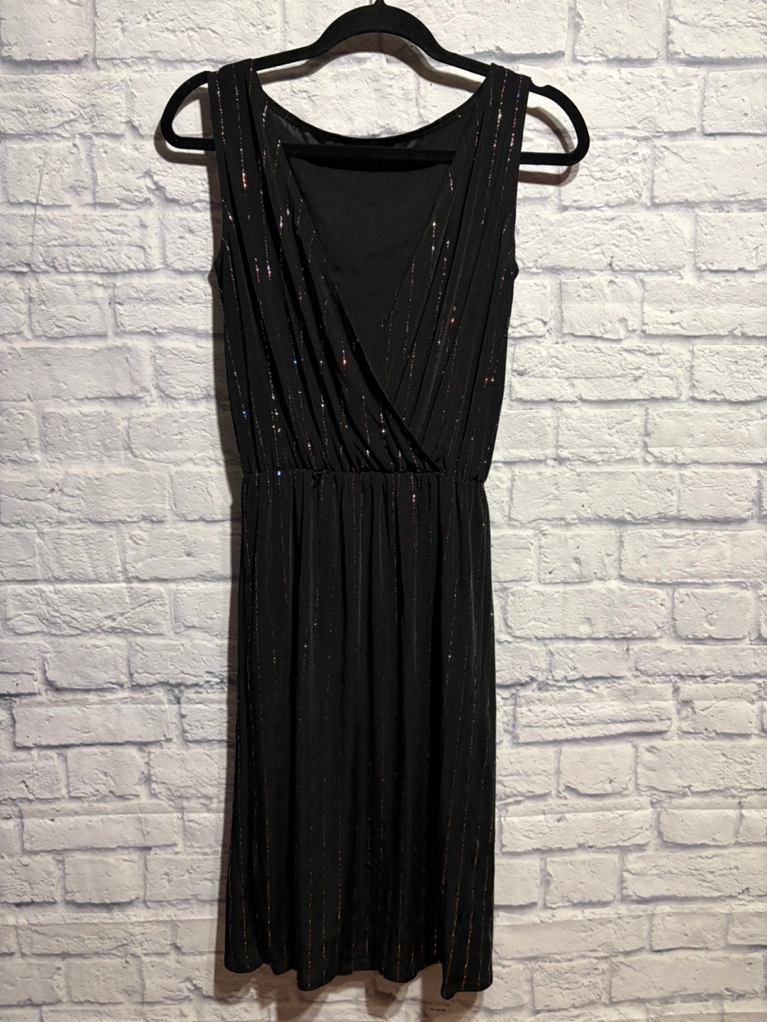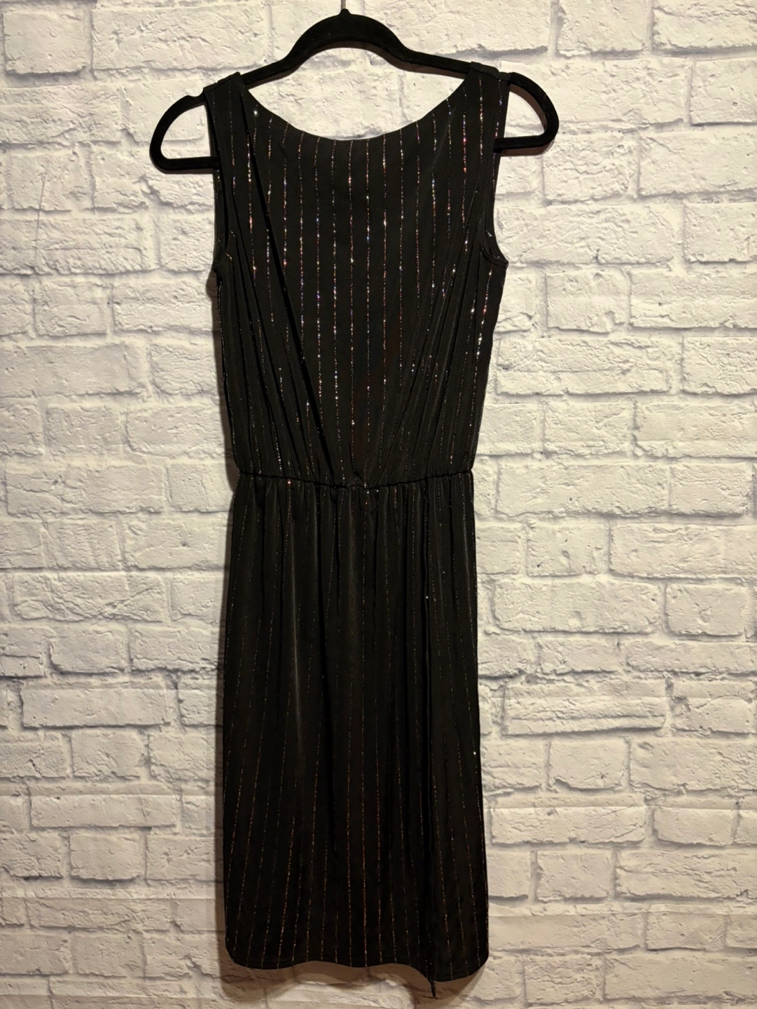 Stunning black midi dress. Features colourful sparkly lines and a flattering fit. Sleeveless design, v back. XS size. Pick up only.
