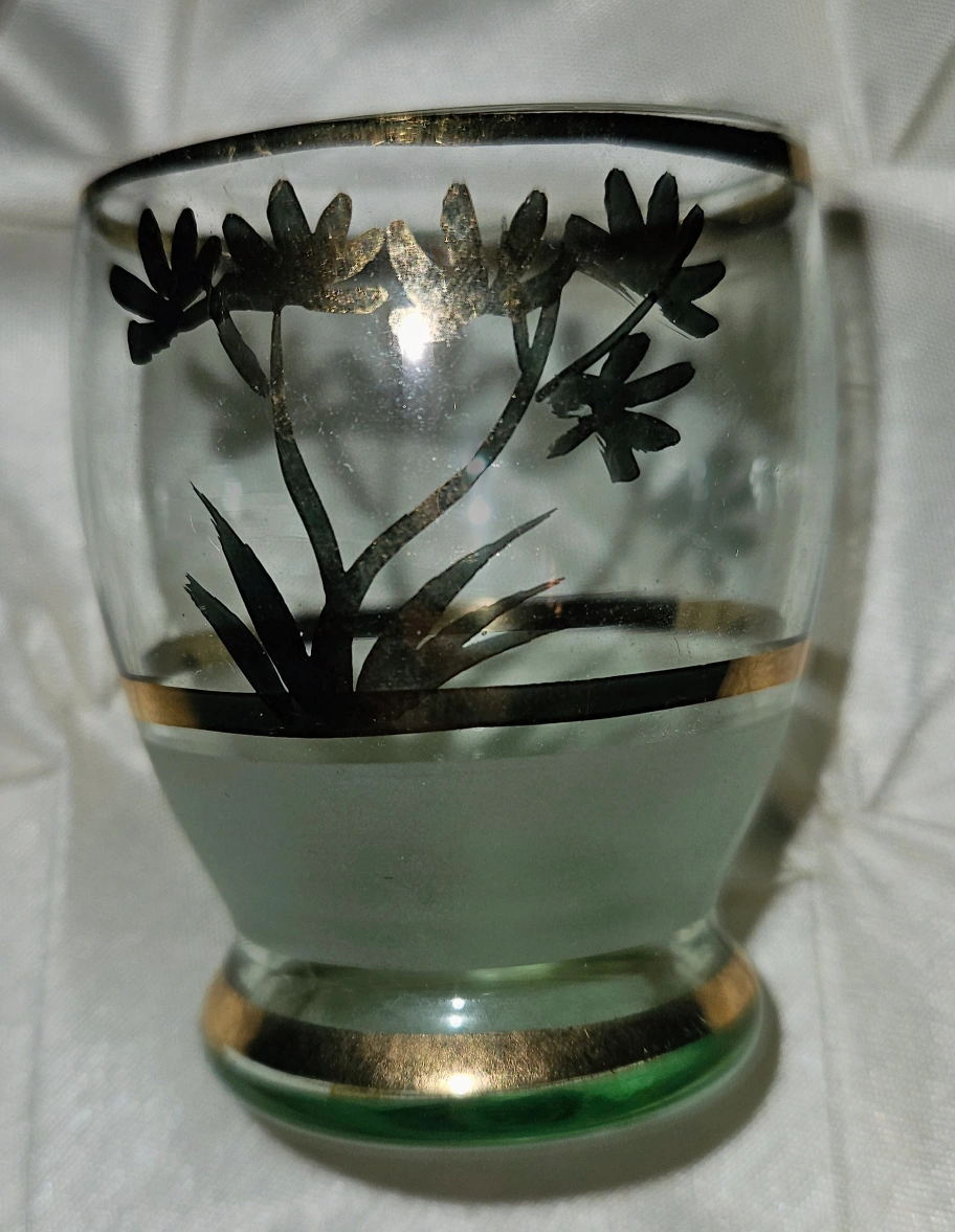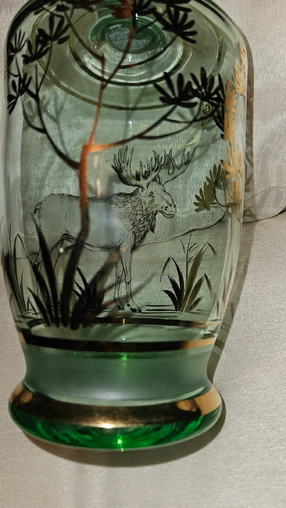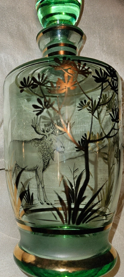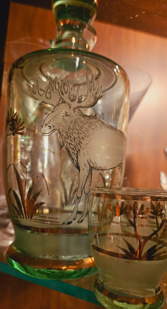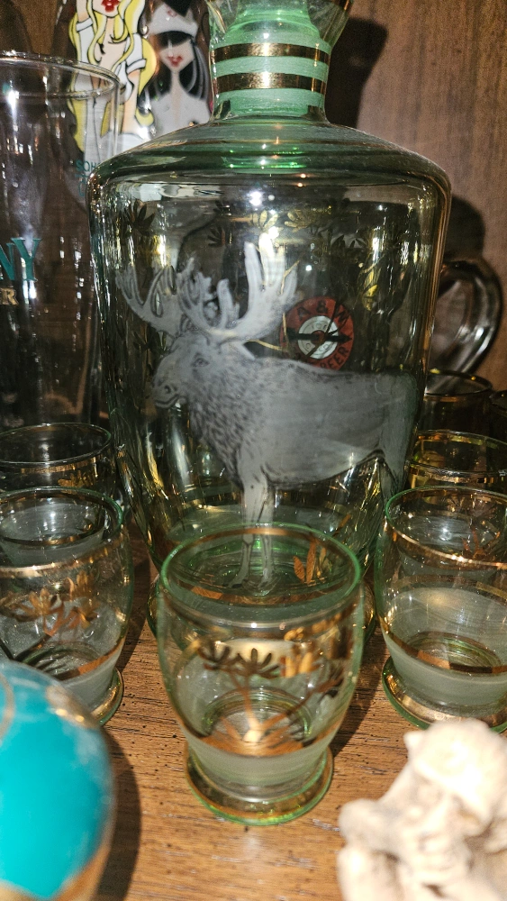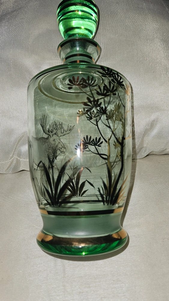 119Beautiful vintage decanter. Features a frosted moose design. Green glass with gold accents. Includes 6 coordinating shot glasses. Great for collectors.