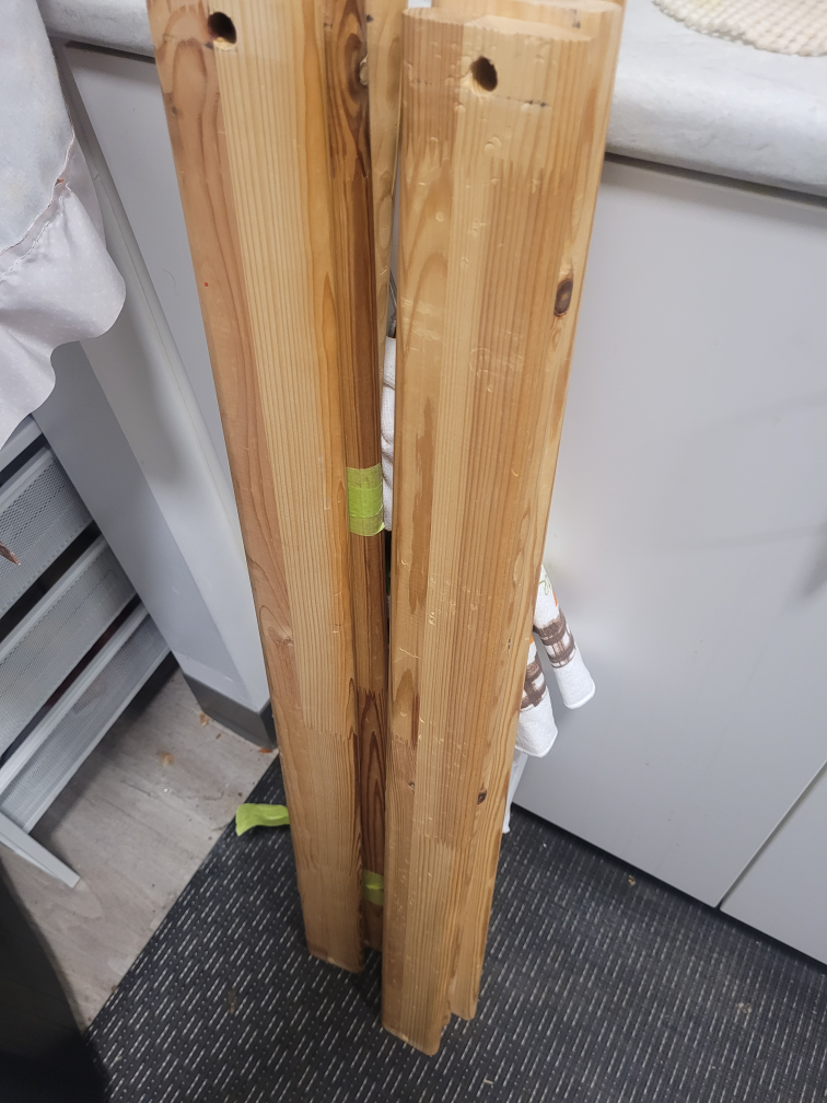 Four unfinished pine wood slats. Pre-drilled holes. Suitable for furniture building projects. Some minor surface imperfections.