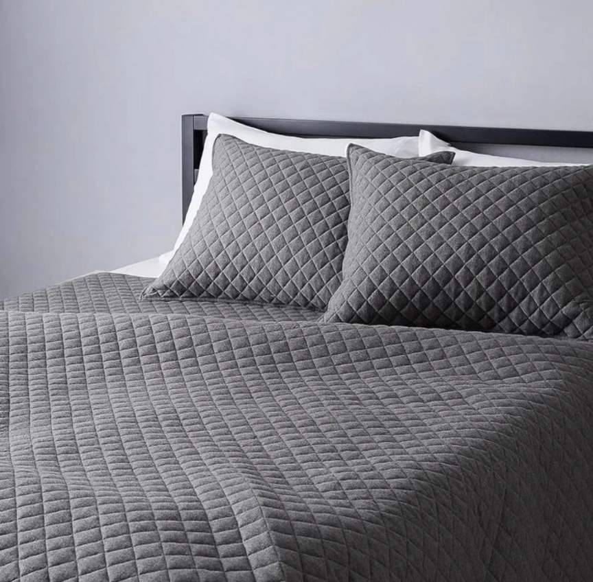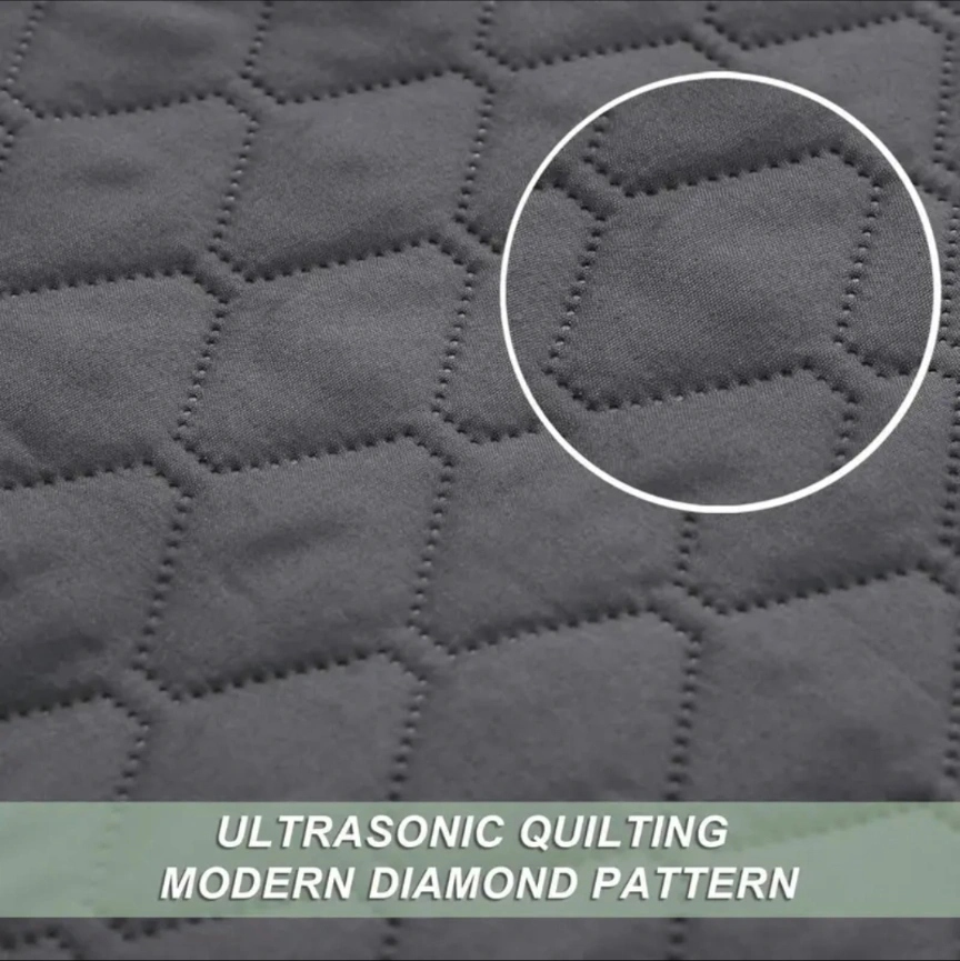 Soft, grey quilted bedspread. King size. Modern diamond pattern. Ultrasonic quilting. Machine washable. Made in China.