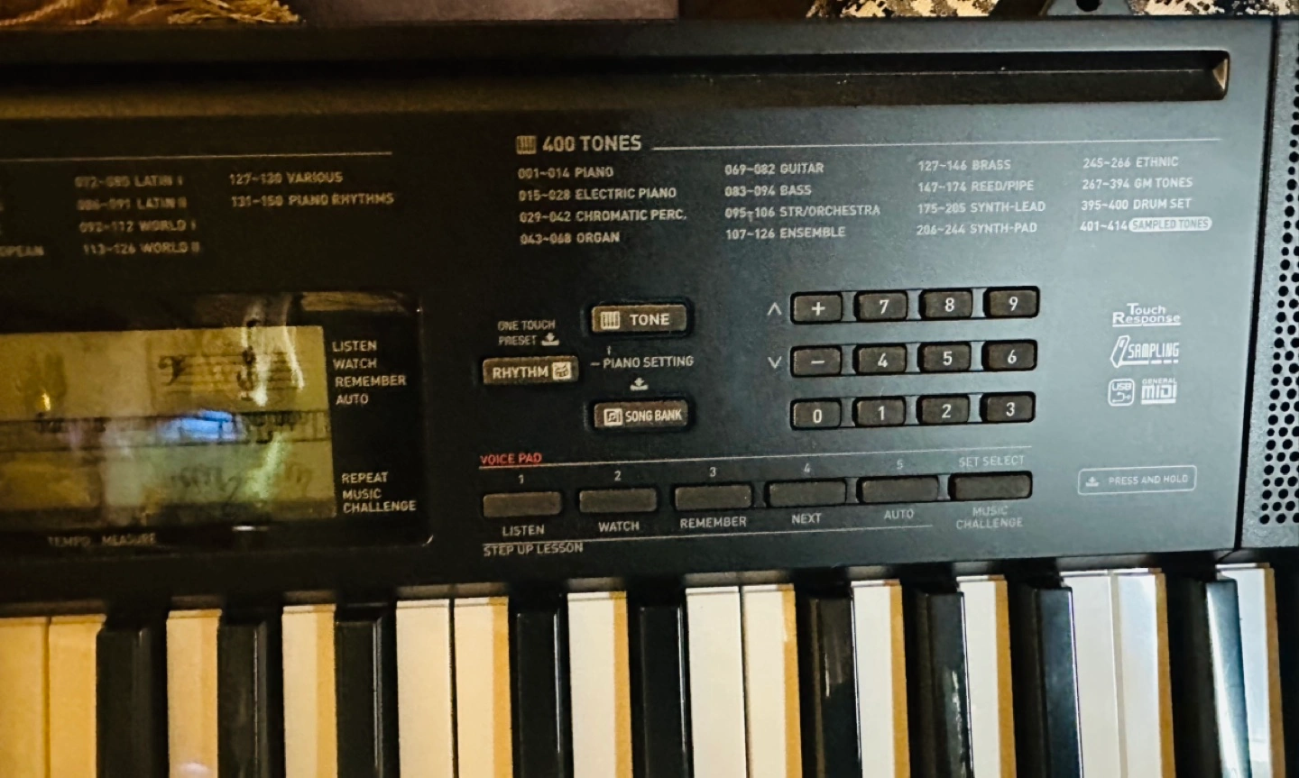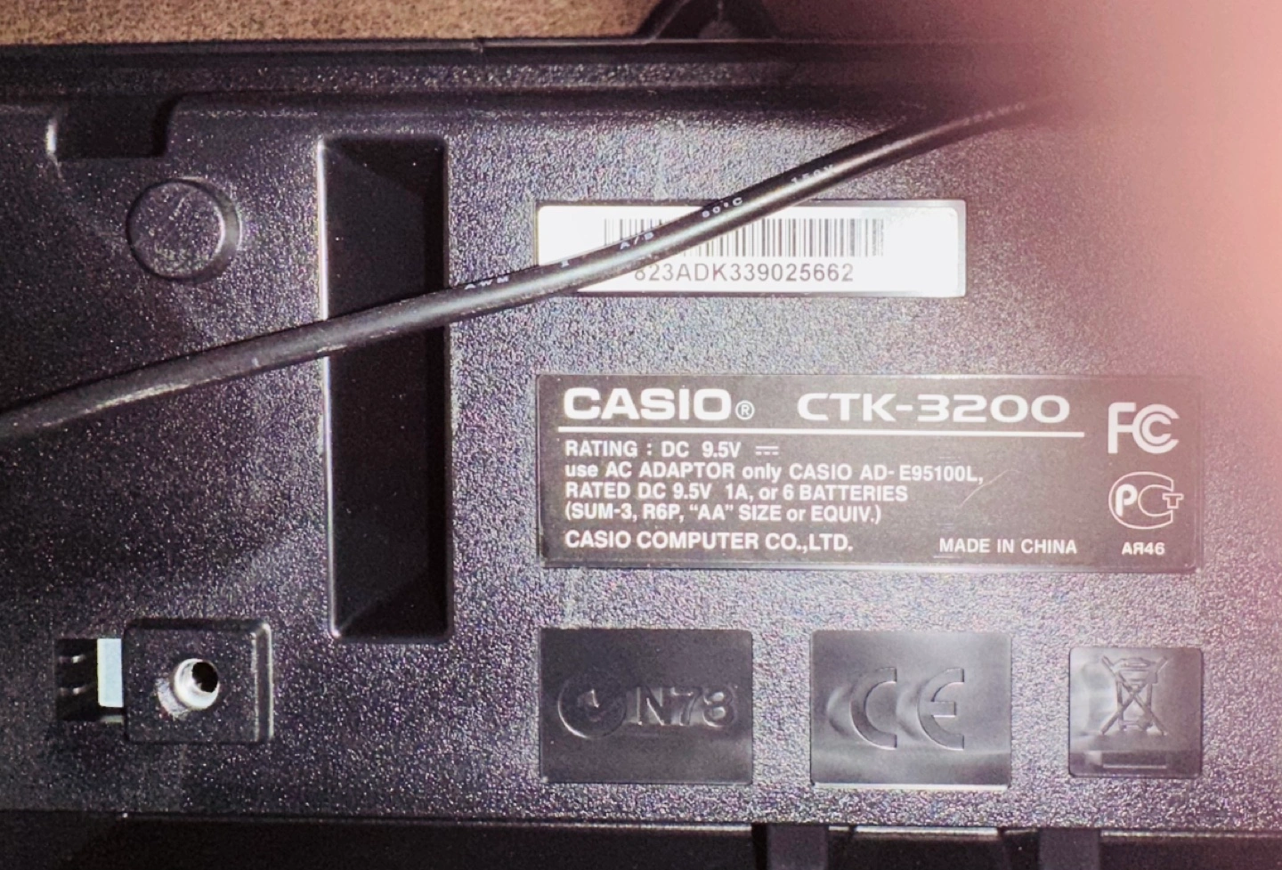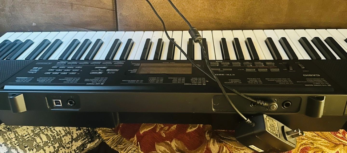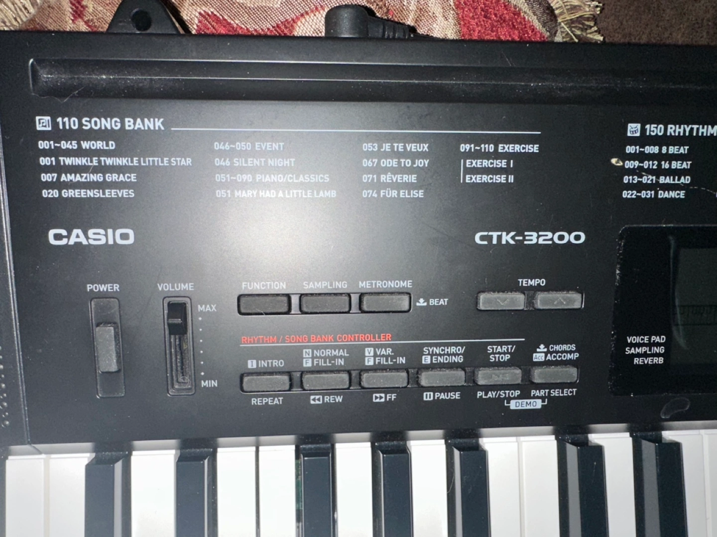 In almost like new condition. Casio CTK-3200 61-key keyboard. Includes numerous tones, rhythms, and songs. Features a LCD screen and various controls. Power cord included.