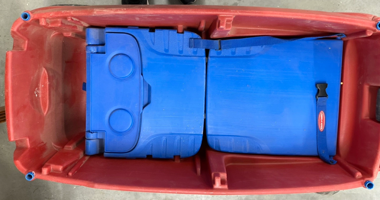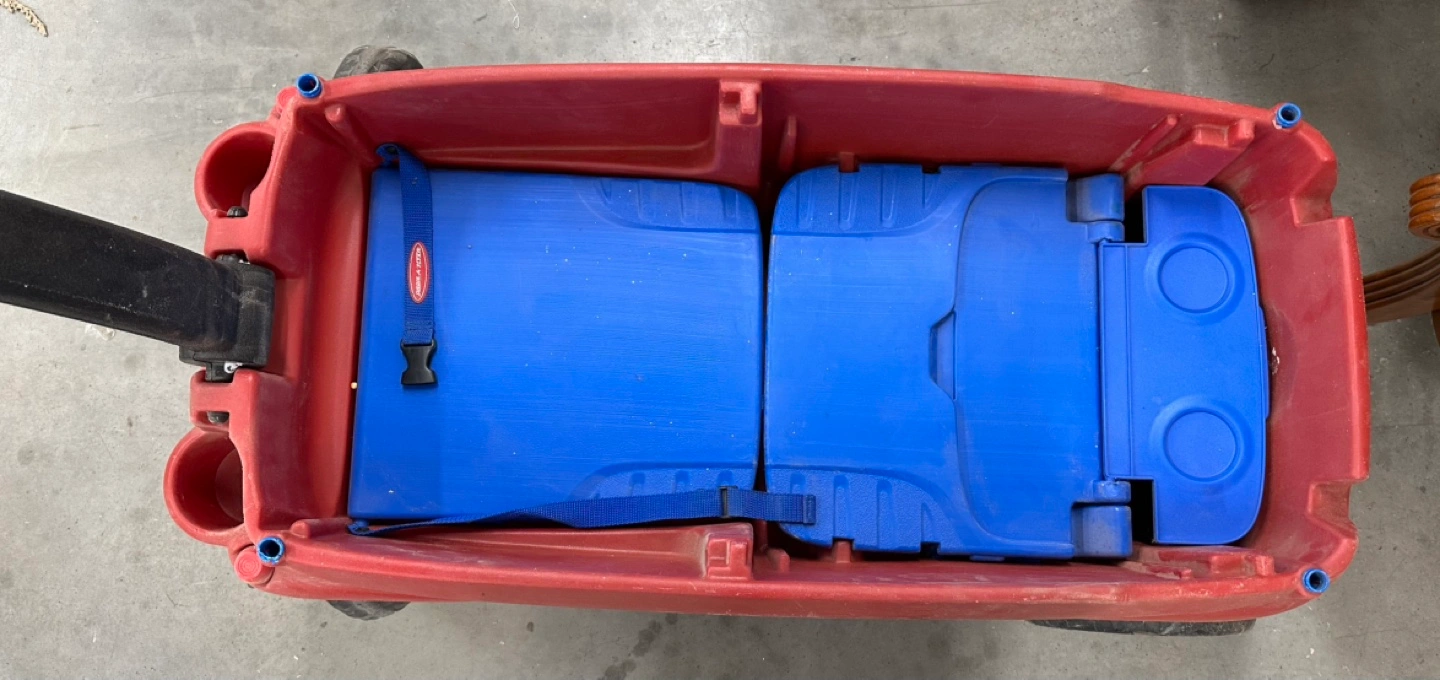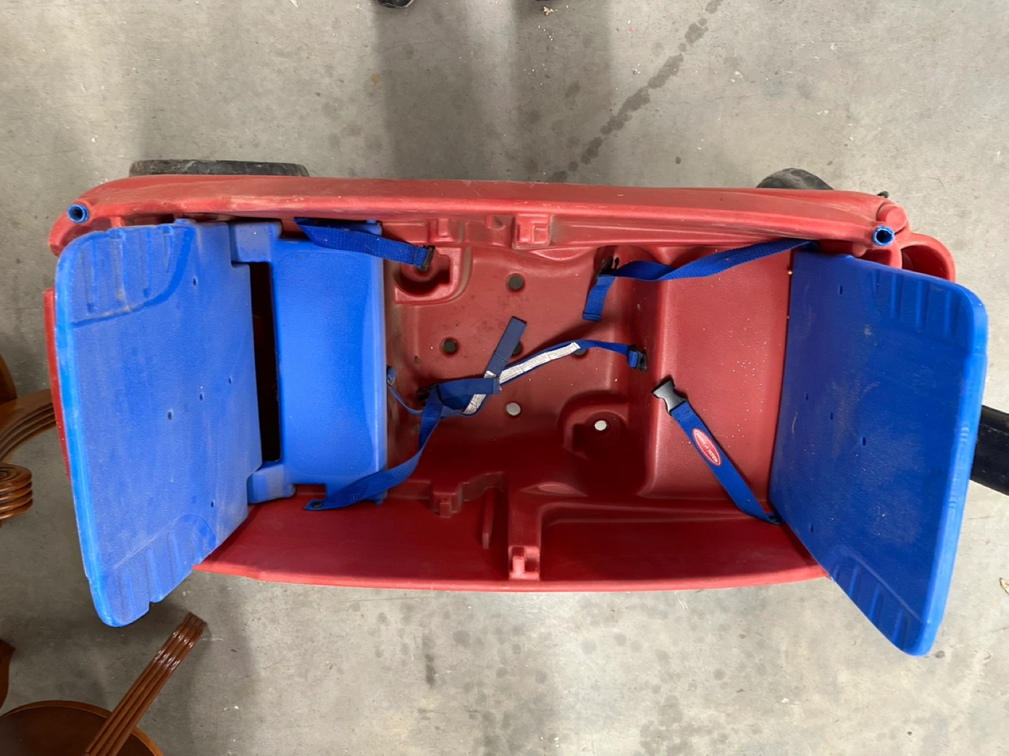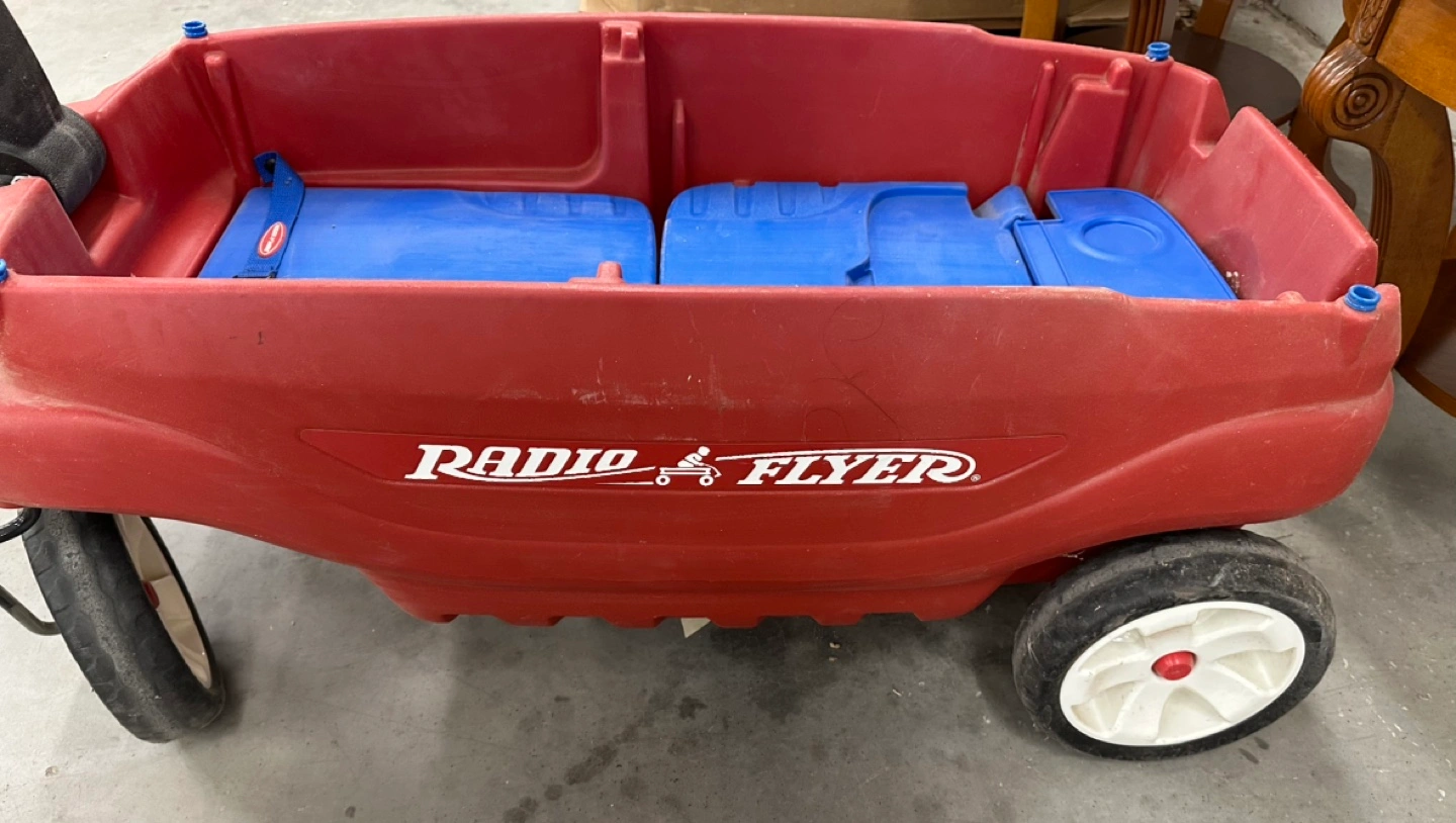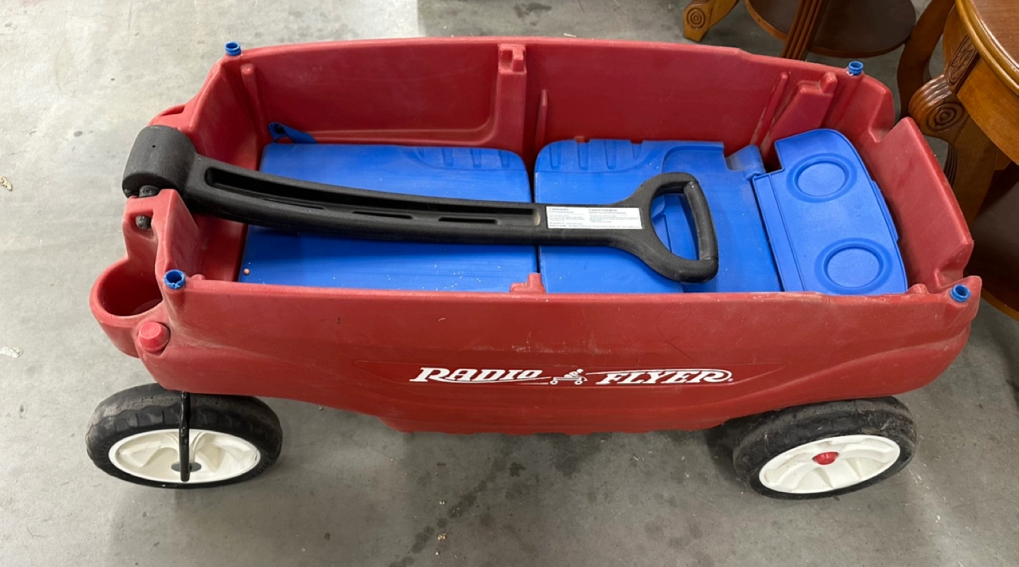 Pre-owned Radio Flyer wagon. Red plastic wagon with blue seats and safety straps. Features two seats and a removable handle. Wheels included. Shows some wear. No canopy Cash pickup only.