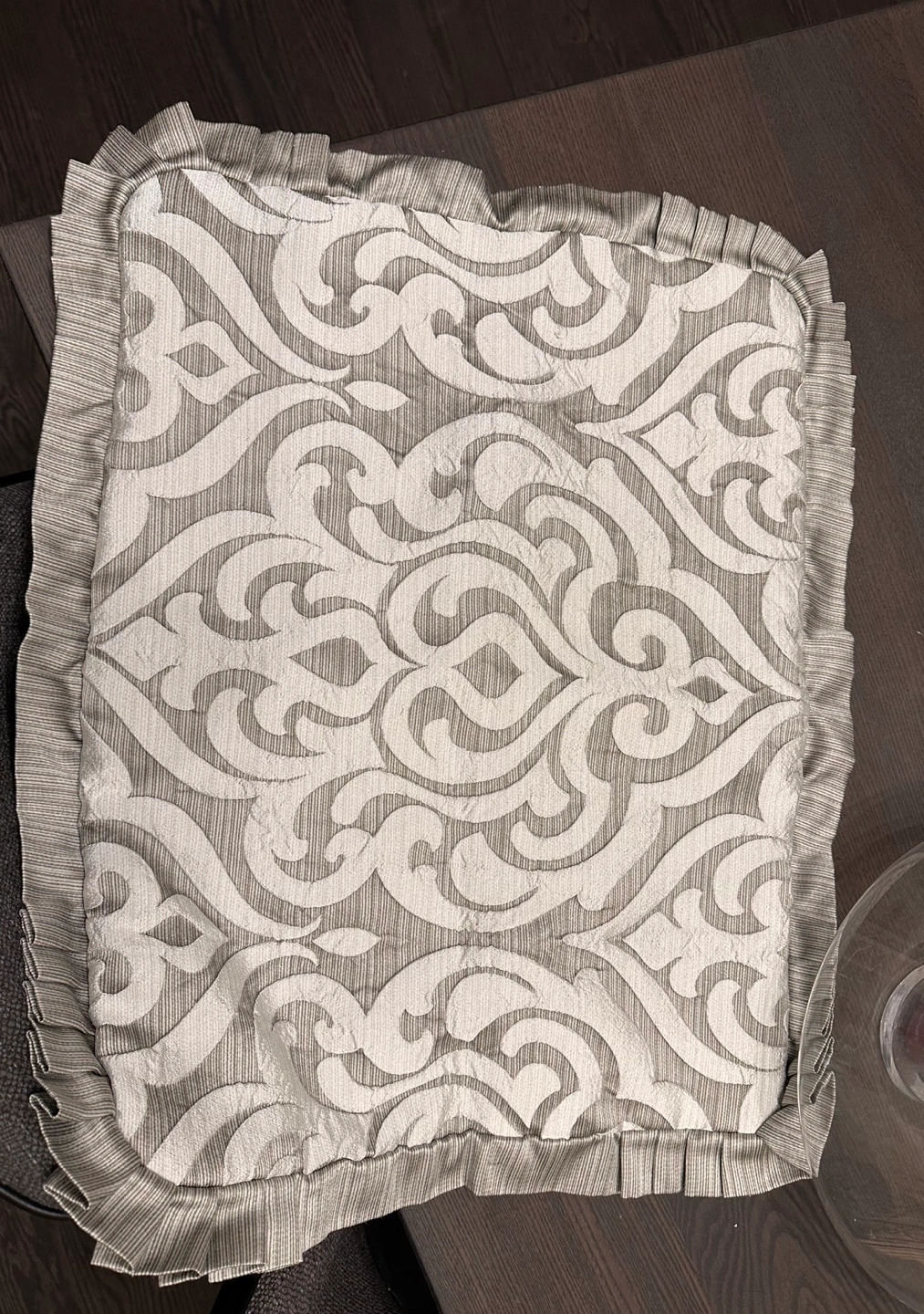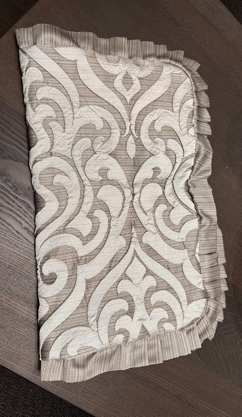 522Elegant cushion cover. Features a beige and grey damask pattern. Trimmed with a ruffled edge. Soft material. Great for adding a touch of elegance to your home decor.