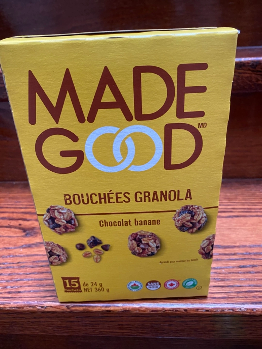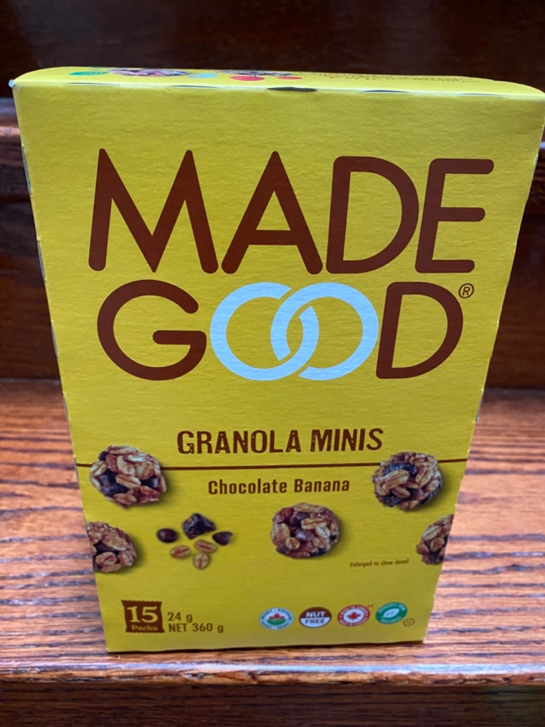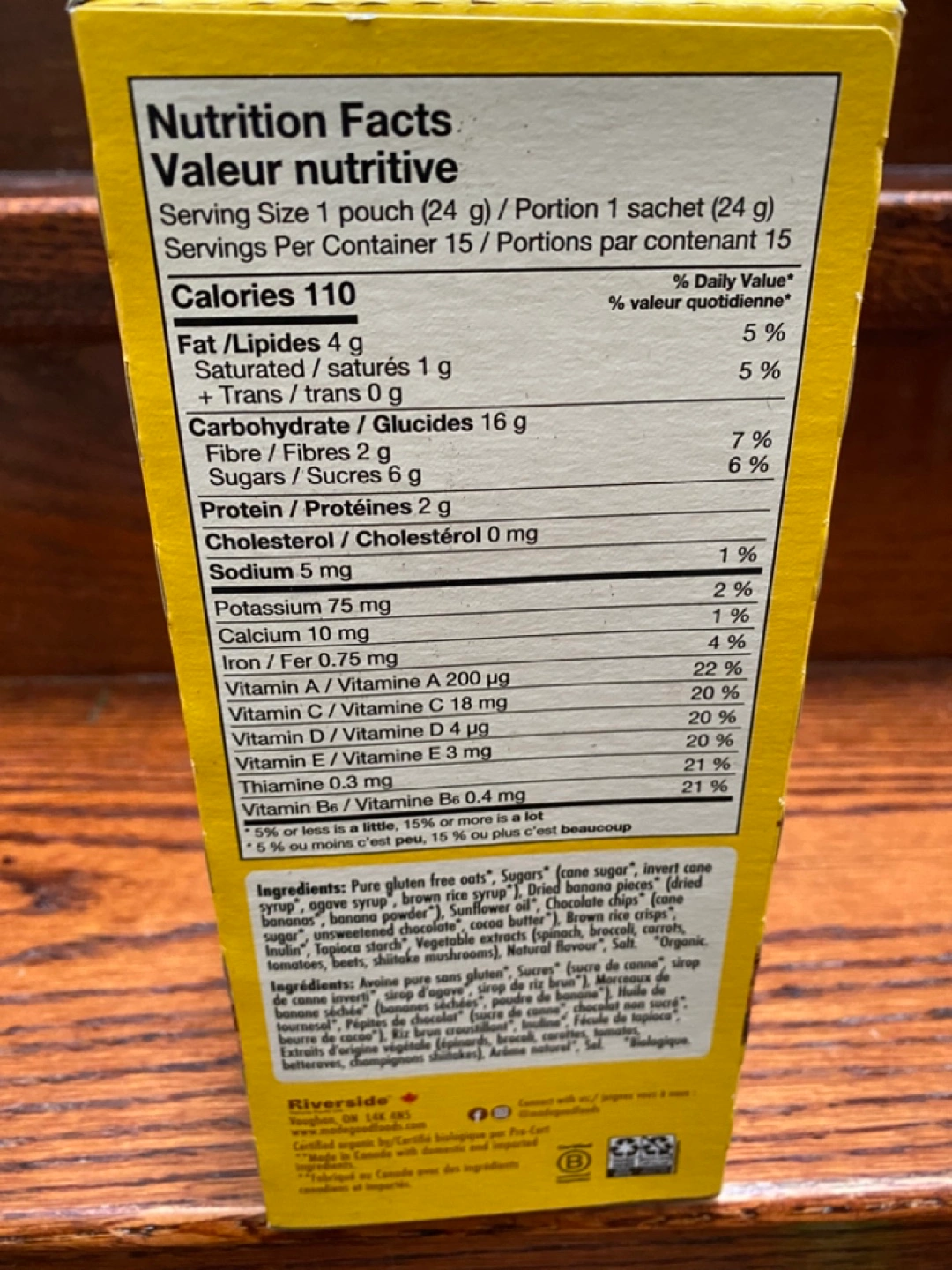 51815 individually wrapped granola mini pouches. Chocolate banana flavour. Nut-free. Source of Vitamins C & D. 360g net weight. Expiry date: March 2025