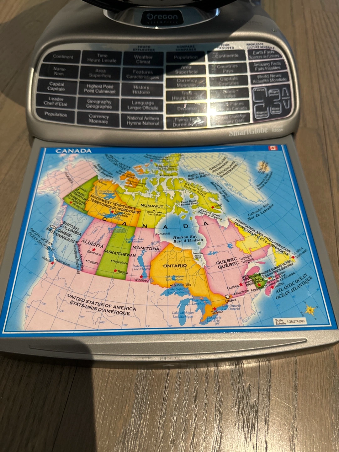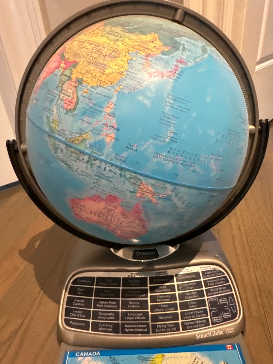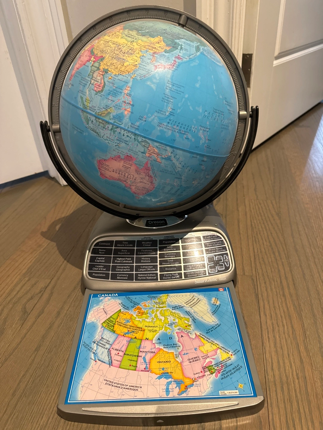 24Interactive globe with rotating base. Features a button interface with various geographical and factual information. Includes a separate map of Canada. Excellent educational tool for children.