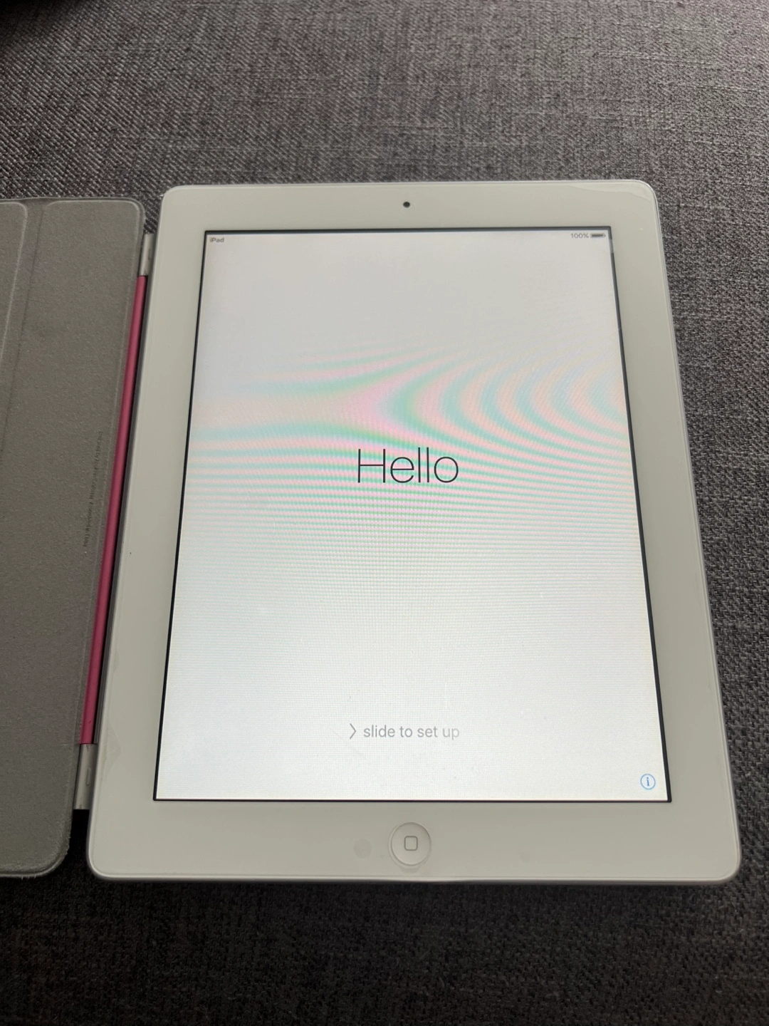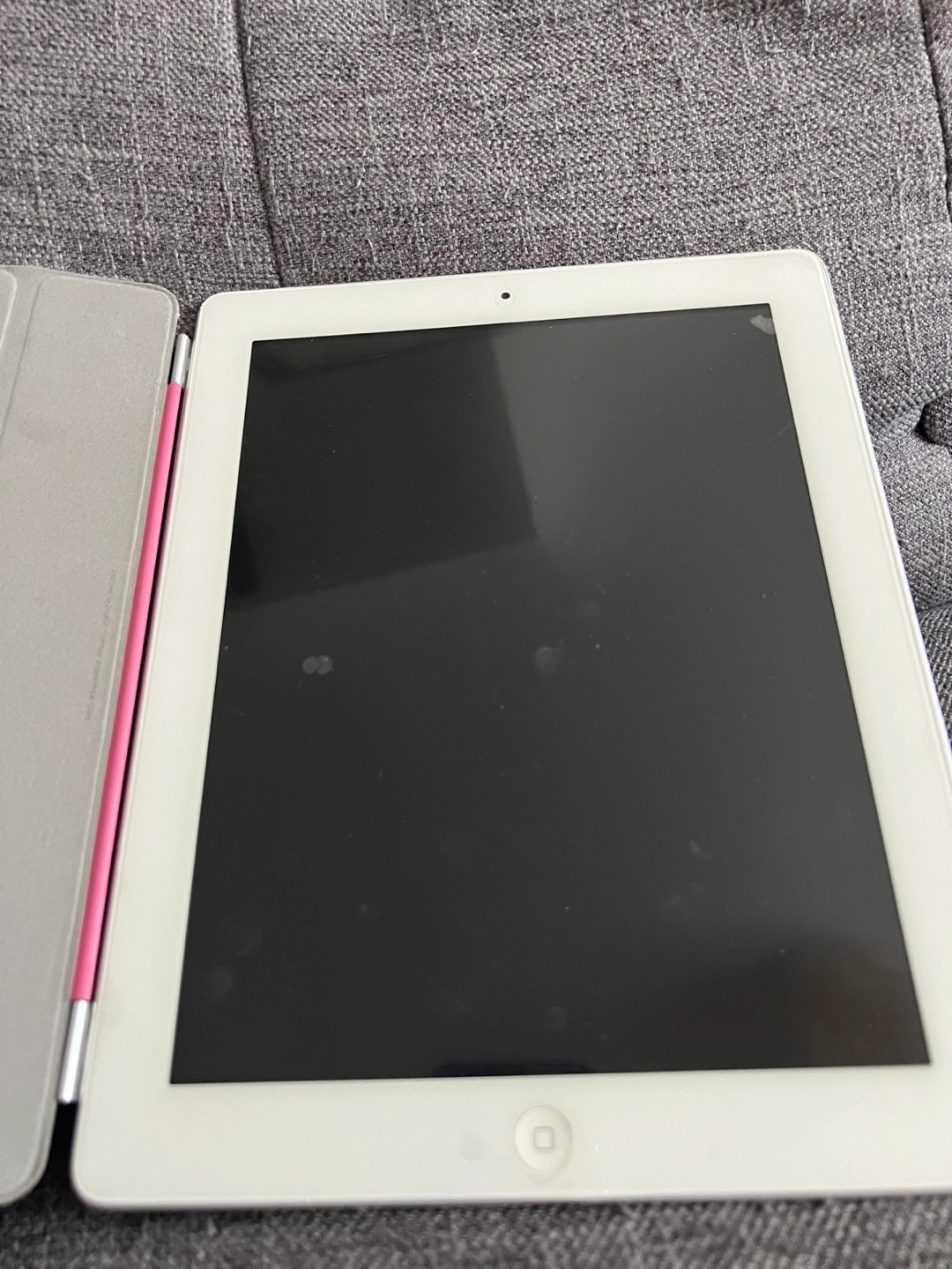 Pre-owned iPad, 32GB. White. No cracks or damage on the screen. The little bubble is from a screen protector. It charges to 100%. I’m unsure of how long the battery lasts as I’ve already factory reset the device so I can’t test it out.
