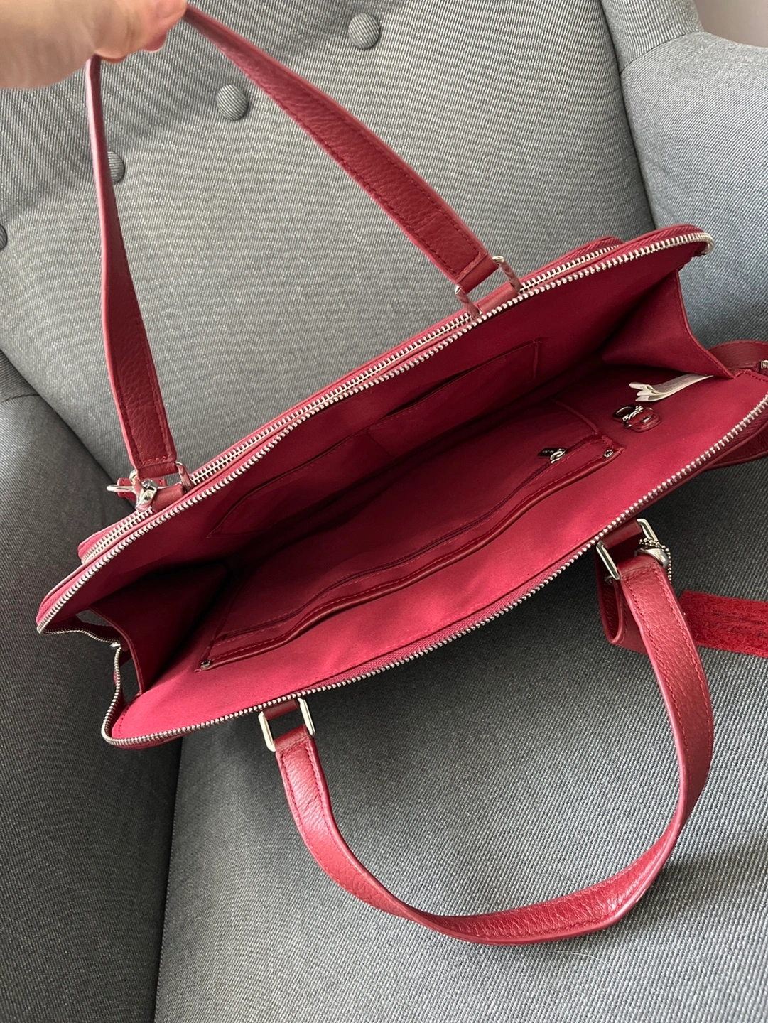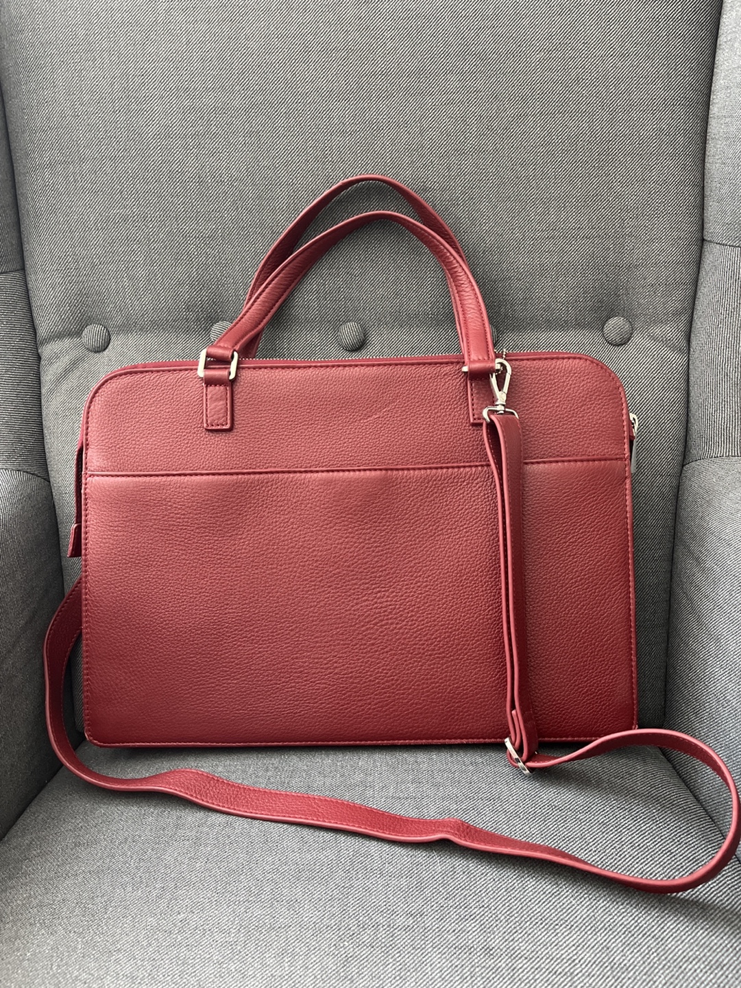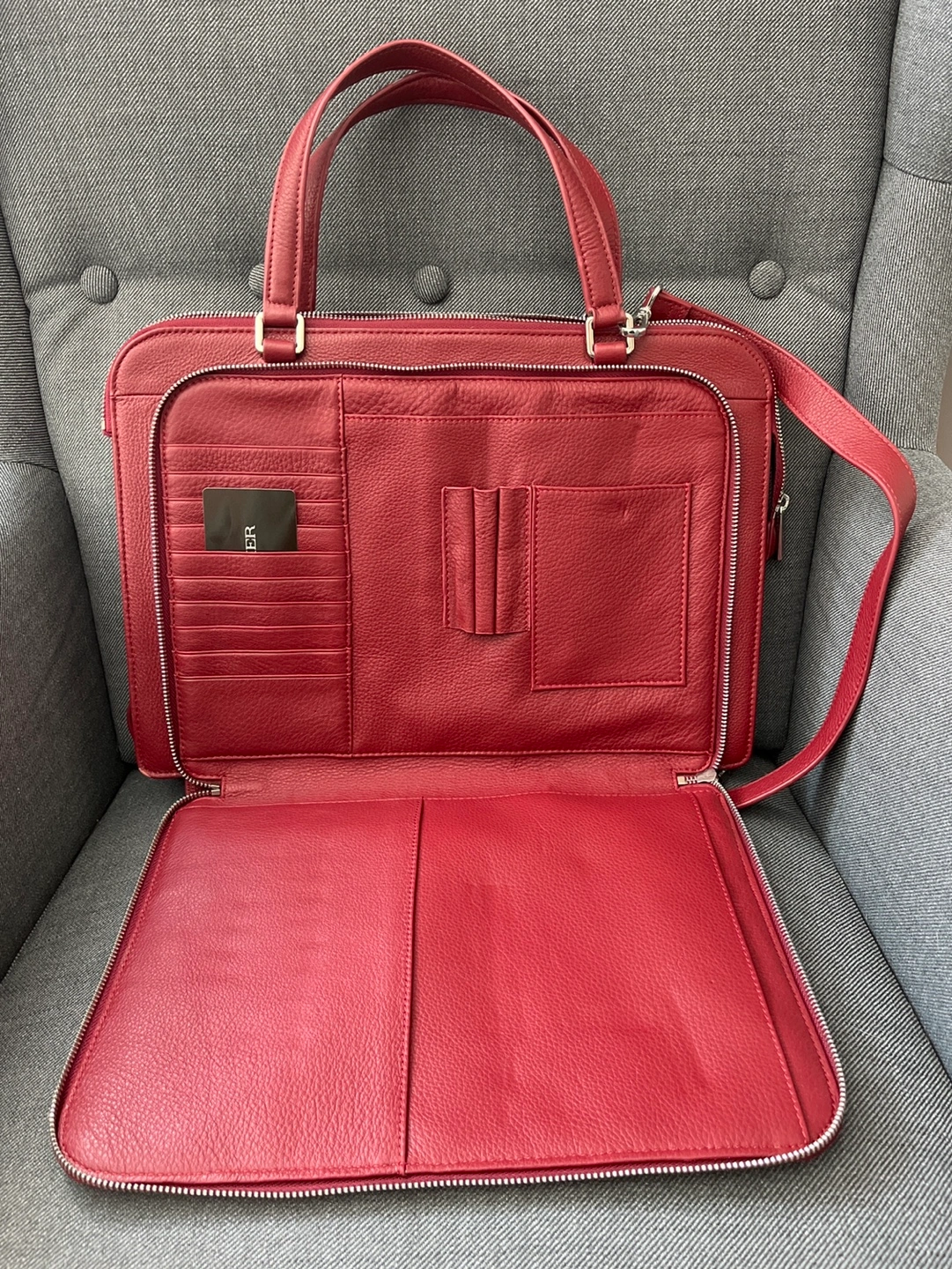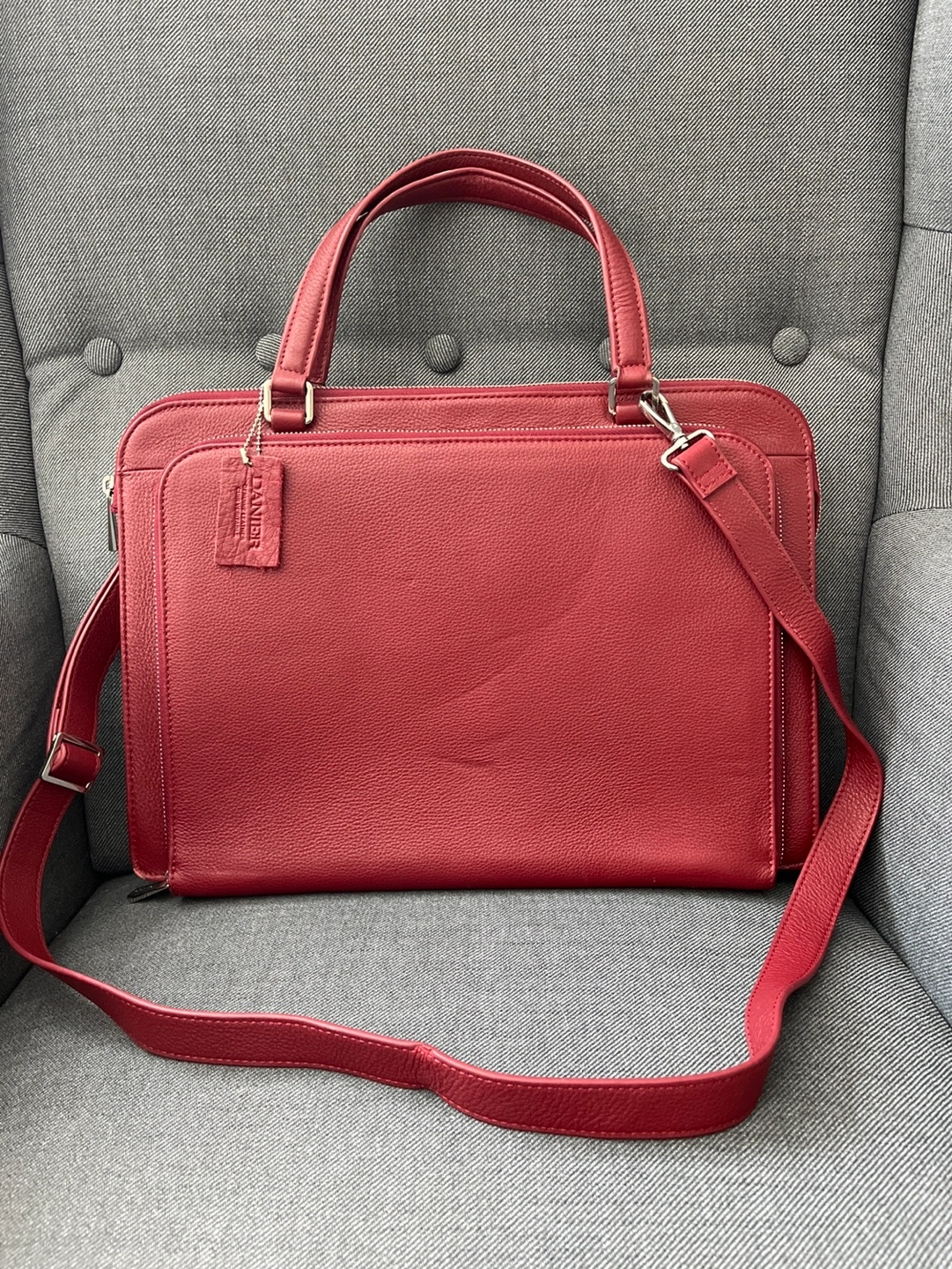 Stylish red leather laptop bag by Danier. Features a zip closure, top handles, and an adjustable shoulder strap. Multiple interior pockets for organization. Great for work or travel.