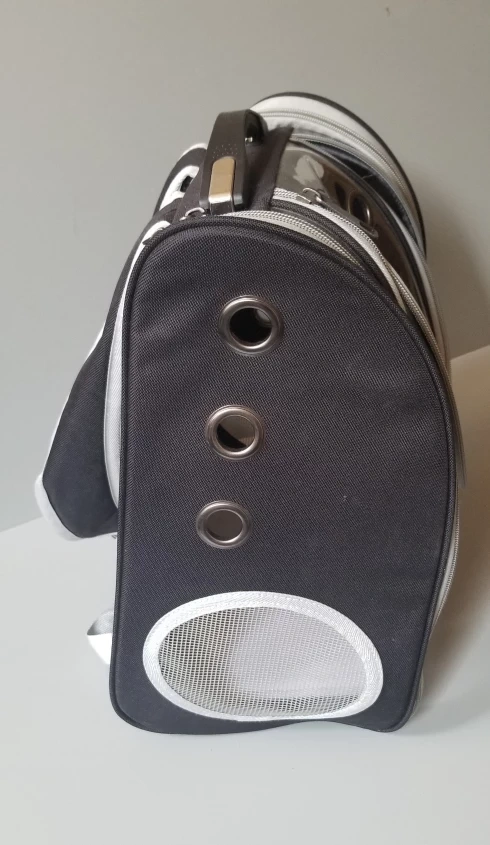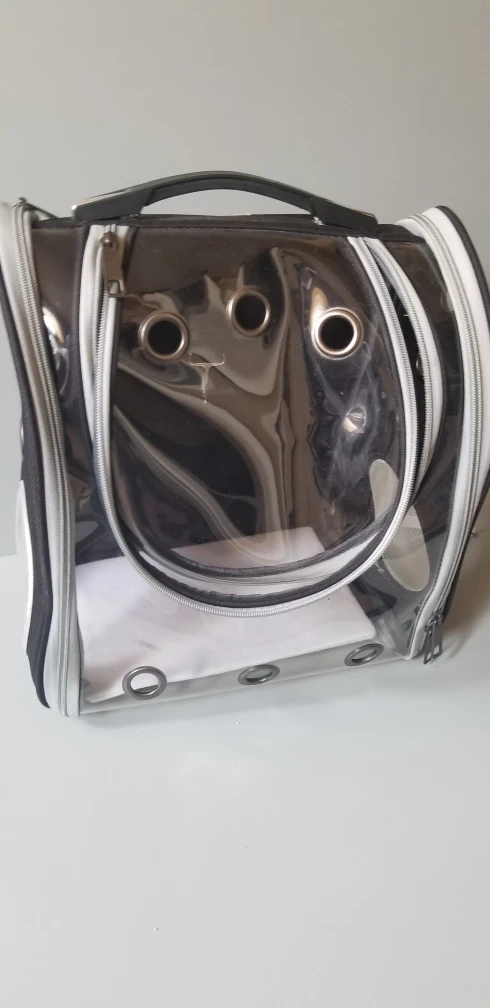 Black and grey pet carrier. Clear plastic front and sides. Multiple ventilation holes. Adjustable backpack straps. Carry handle. Zipper closure.