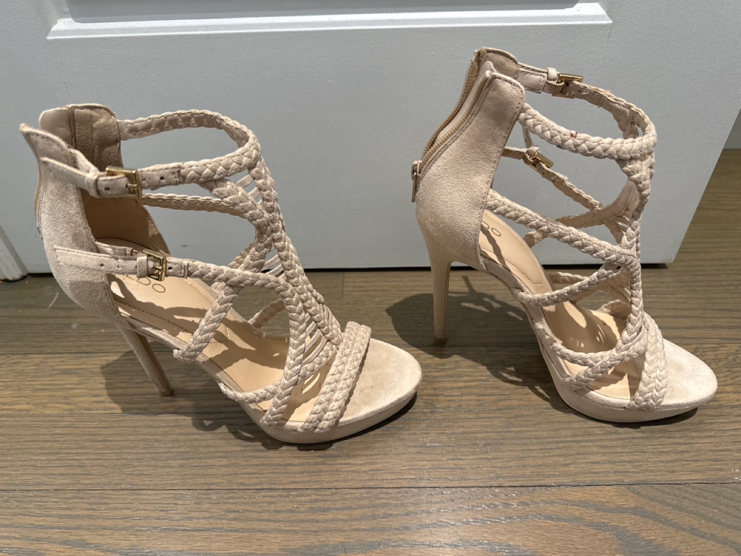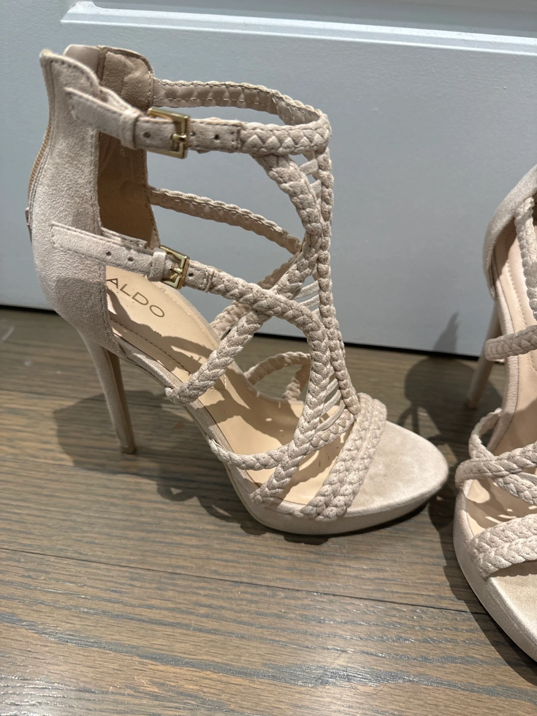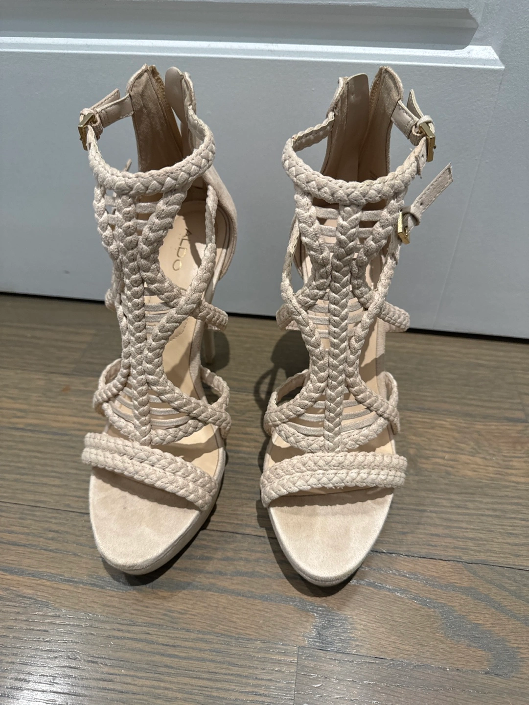 24Beautiful beige high heels. Braided design. Ankle strap with buckle closure. High stiletto heel. Platform sole. Size 8.
