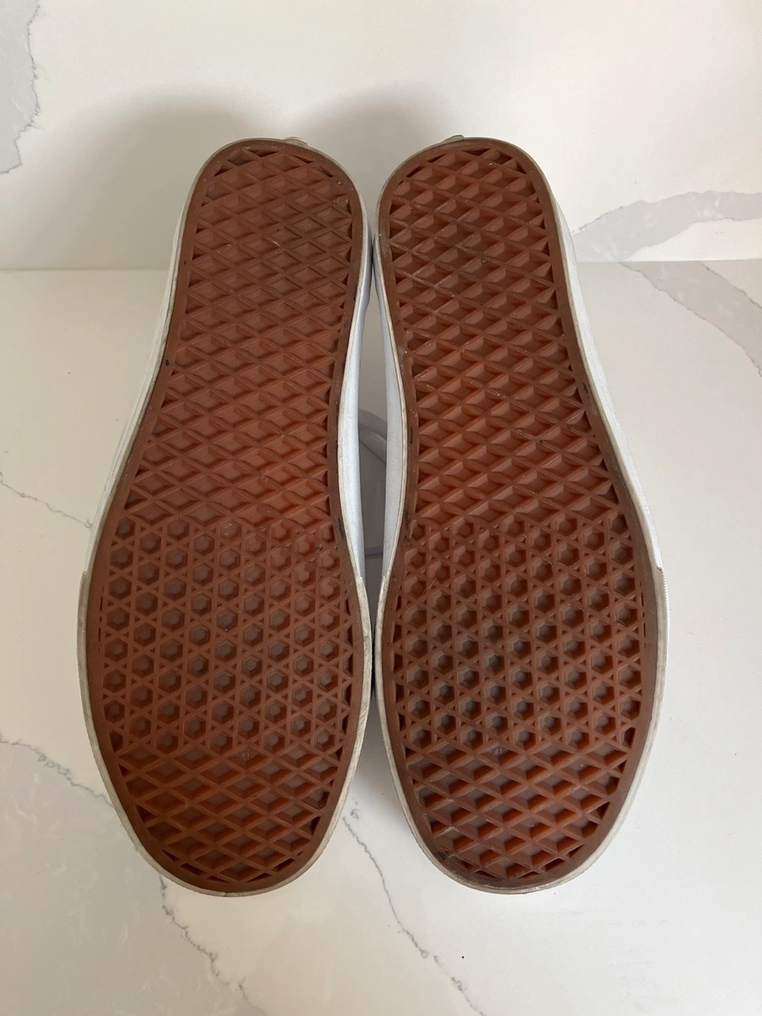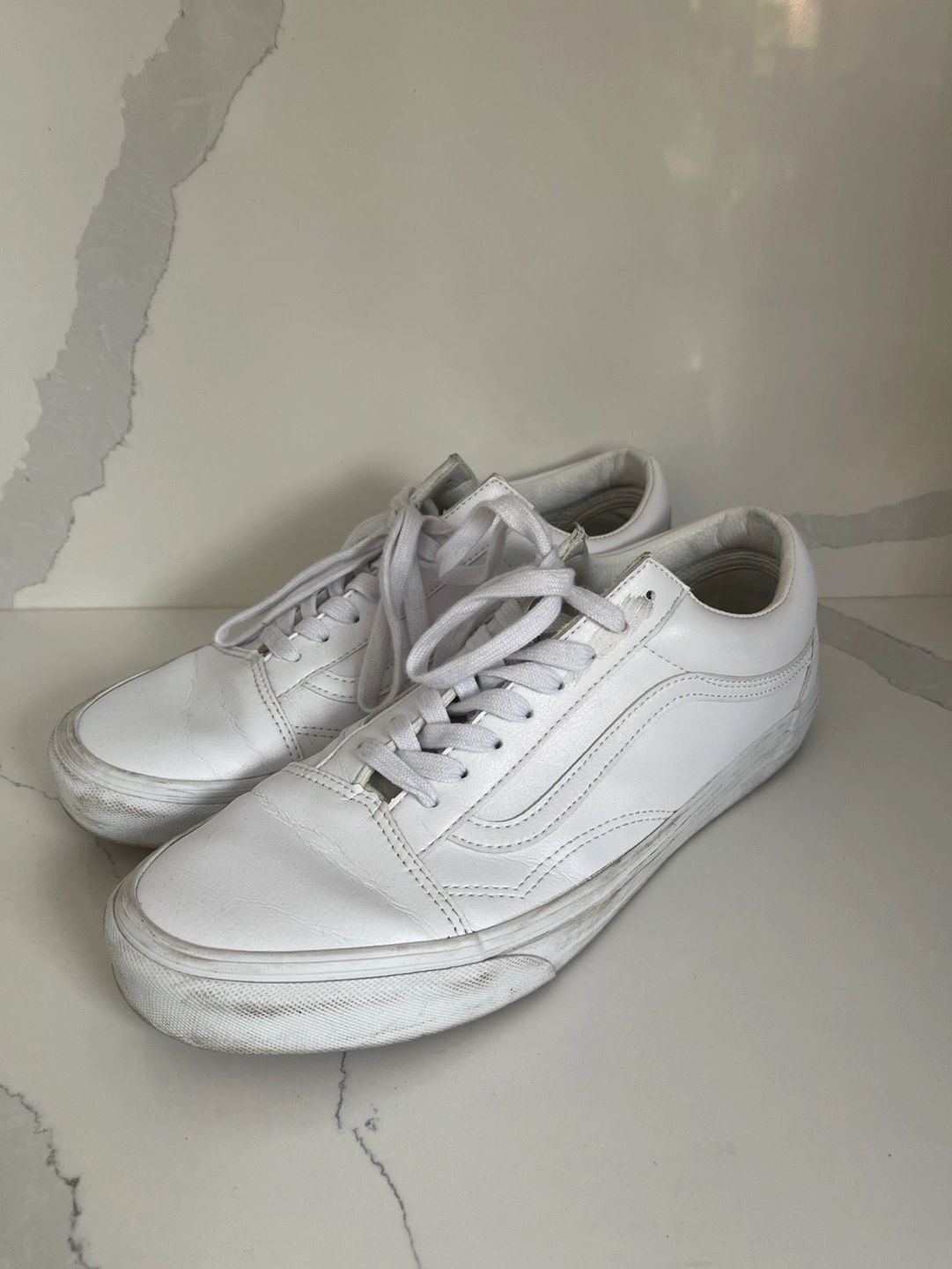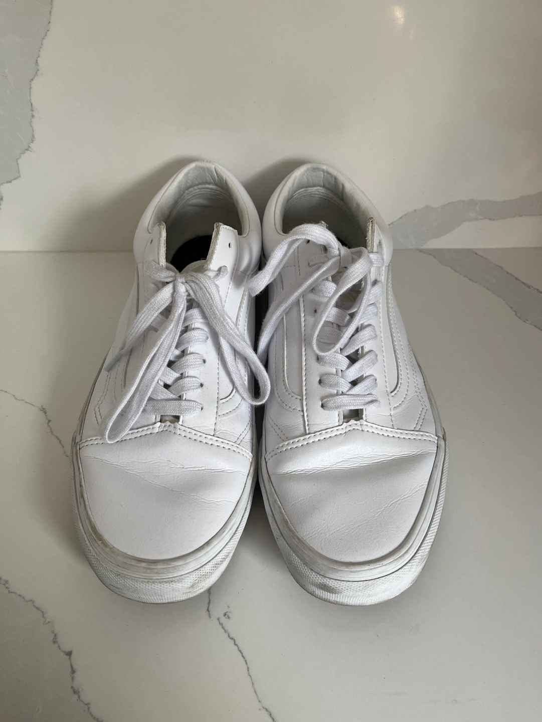 Pre-owned Vans Old Skool sneakers. White leather upper. Classic Vans design. Minor wear and tear with lots of life left!