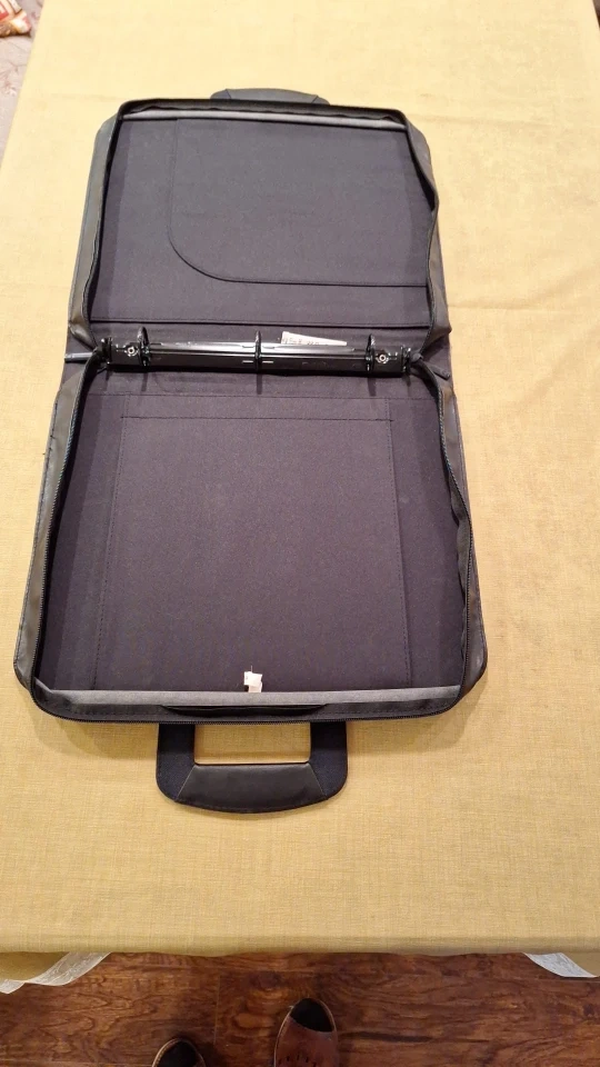 Large black leather portfolio. Three-ring binder. Zipper closure. Interior pockets. Carry handle.