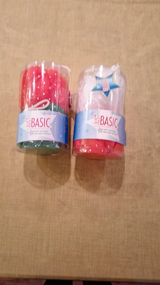 Pair of new bath sponges. Red and white polka dot and solid red. Packaged individually.