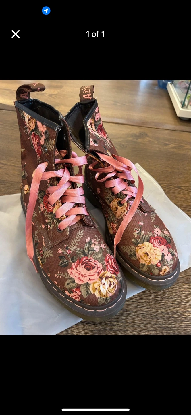Women's floral Dr. Martens boots. Pink laces. Canvas material.