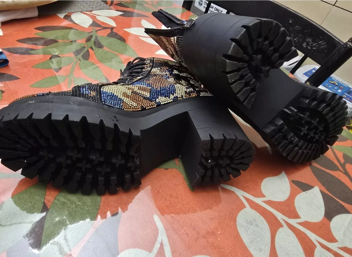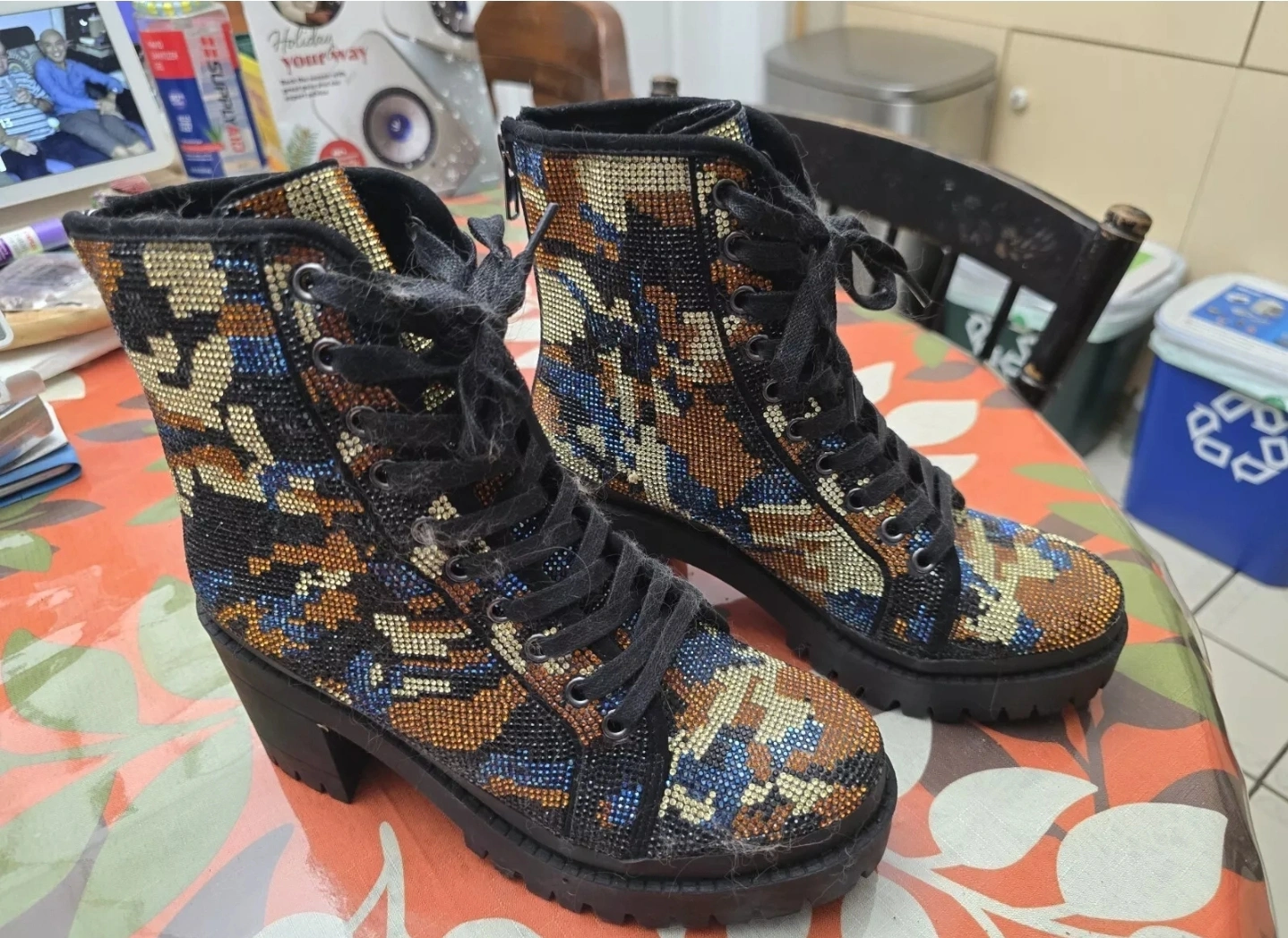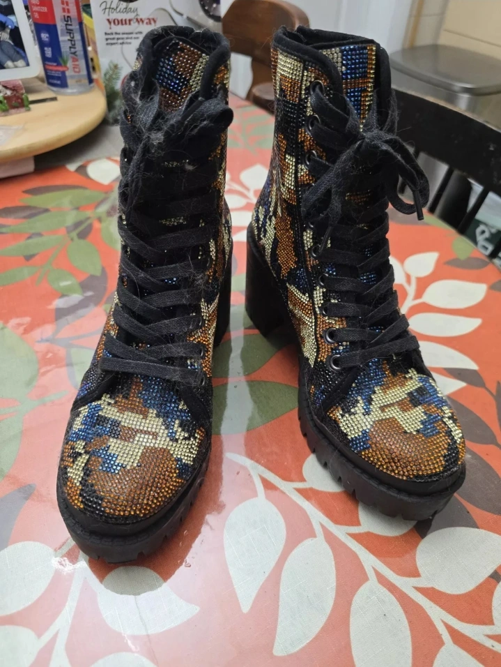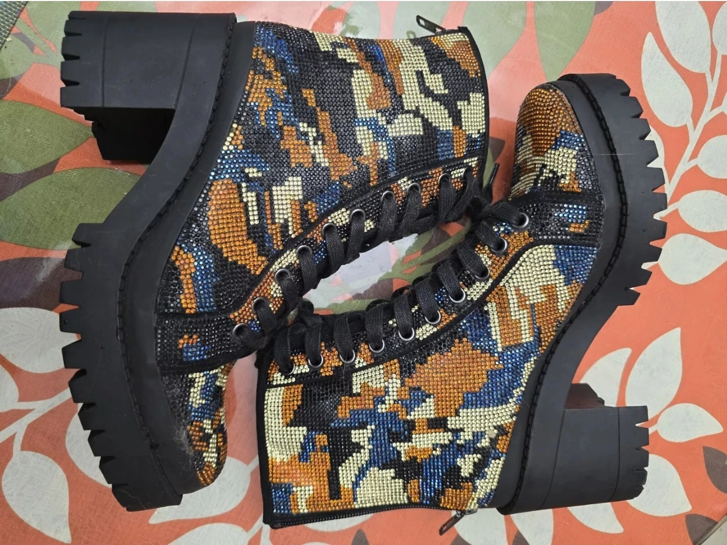 Elevate your style with these Steve Madden ankle boots featuring a round toe and lace-up and back zip closures. The boots have a unique camouflage pattern with accents of textured glass and PU upper material. The block heel style has a height of 3 inches, making it perfect for summer, fall, and spring seasons. The rubber outsole material ensures durability, and the cushioned features provide comfort for long hours of wear. These boots are suitable for various occasions such as travel, dress, party, casual, and formal. They are available in US shoe size 8M and are a perfect fit for women who want to add a touch of disco to their wardrobe.