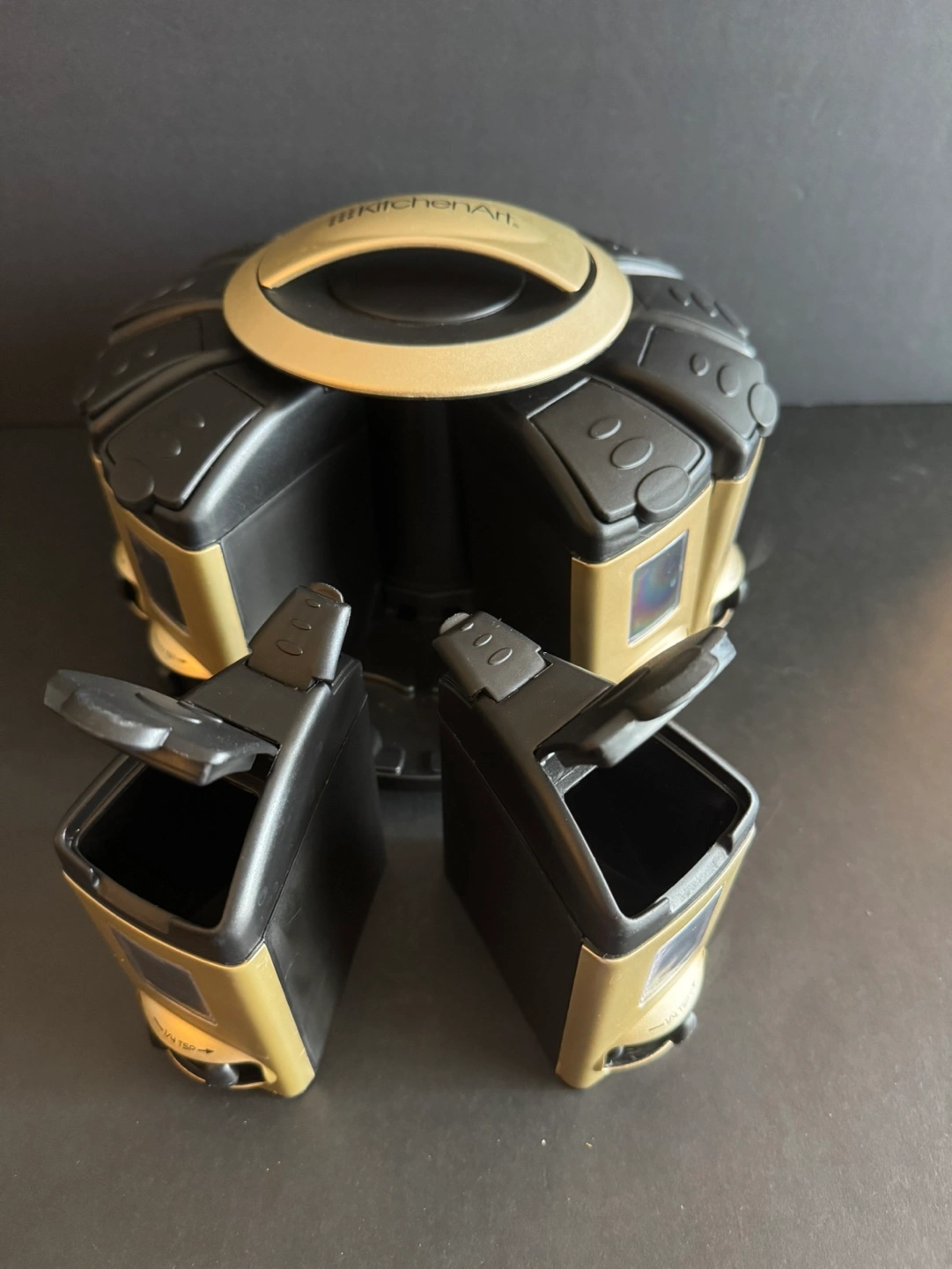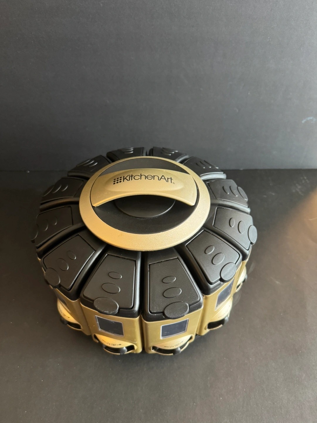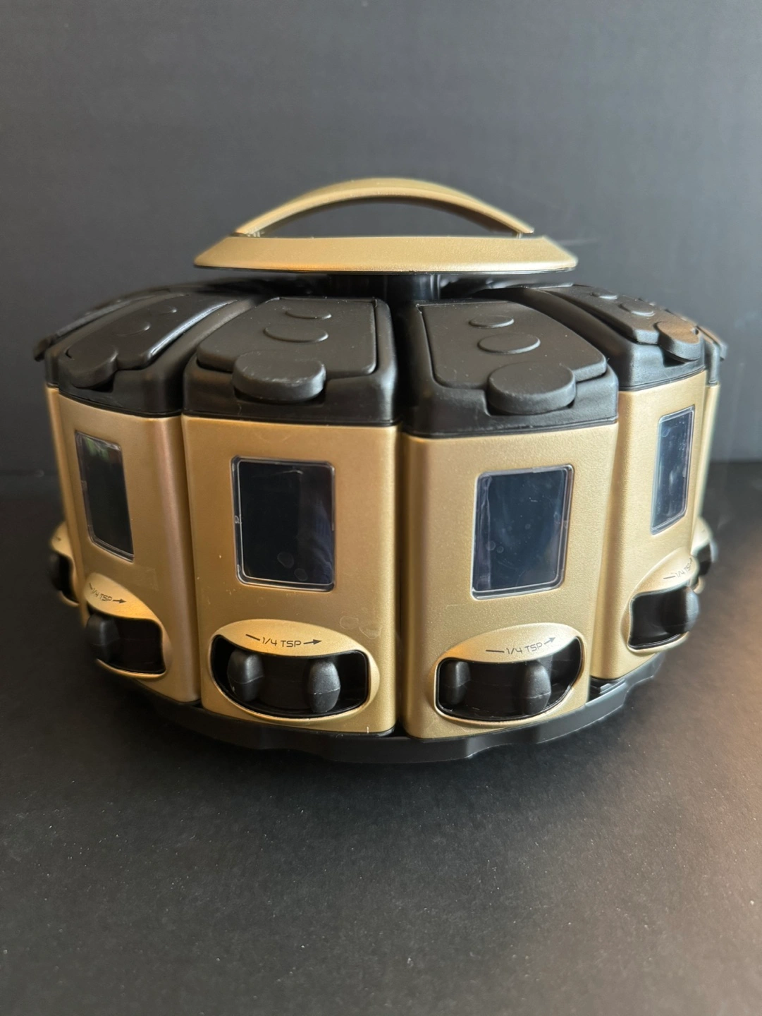 Rotating spice rack. Holds twelve individual spice jars. Compact design. Easy to use. Gold and black.