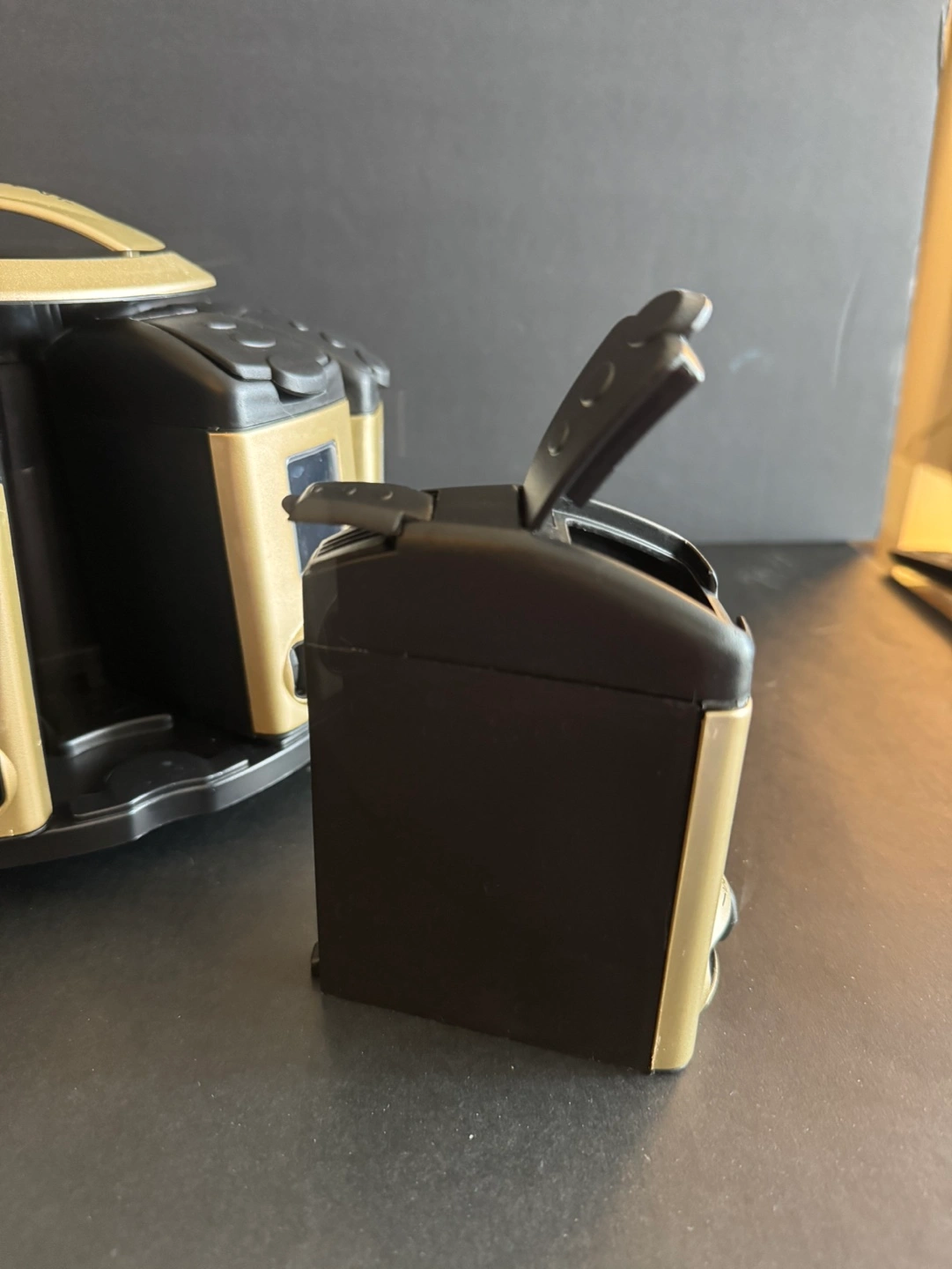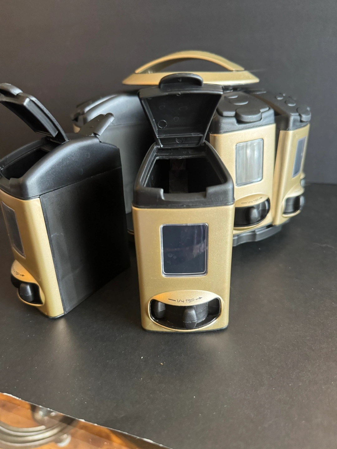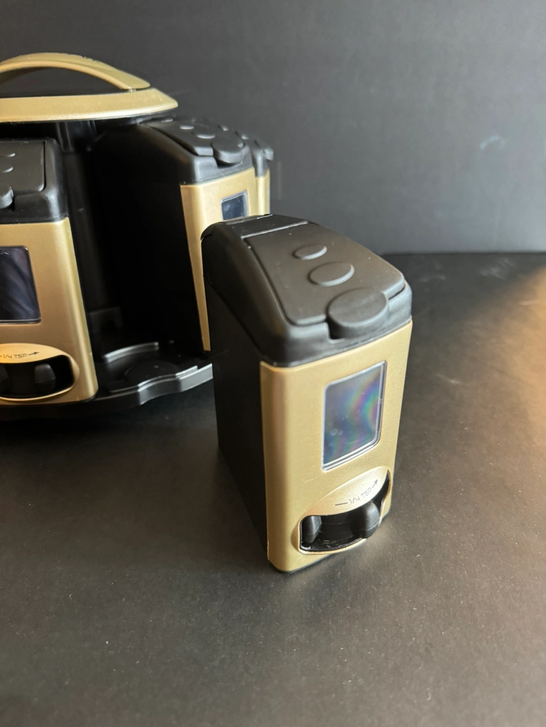 Rotating spice rack. Holds twelve individual spice jars. Compact design. Easy to use. Gold and black.