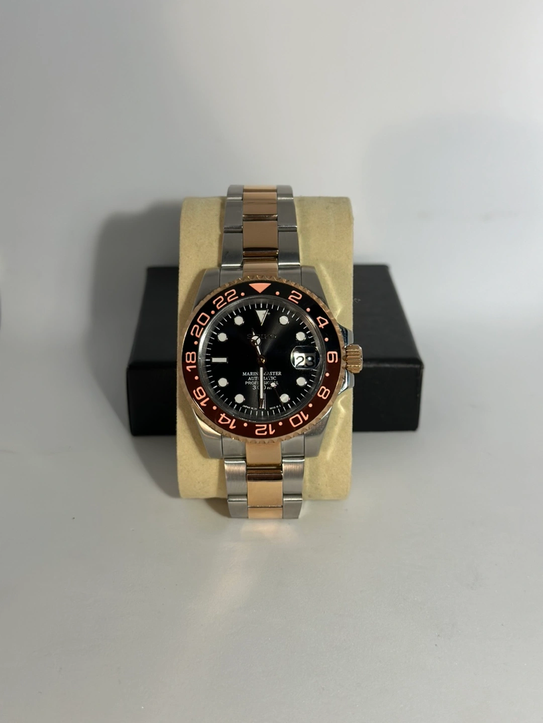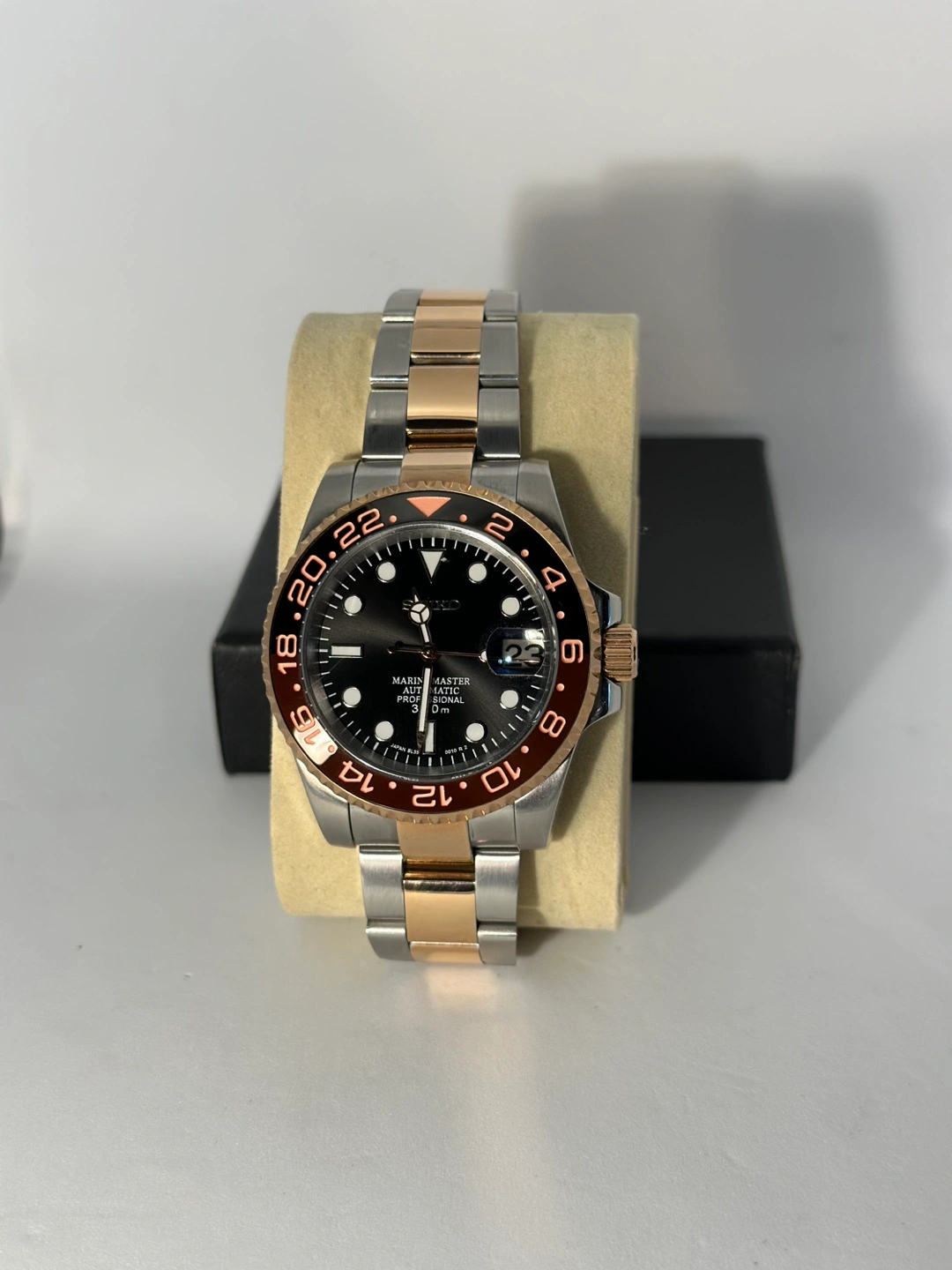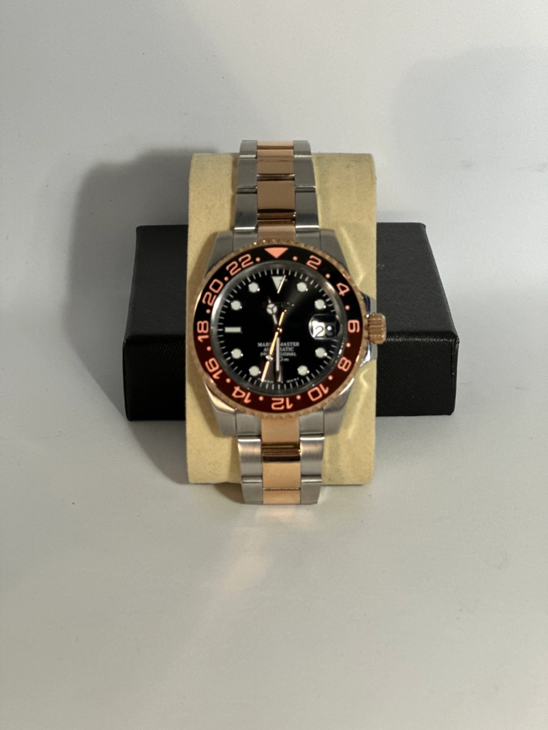Two-tone stainless steel and rose gold band. Black face with rose gold accents. Automatic movement.