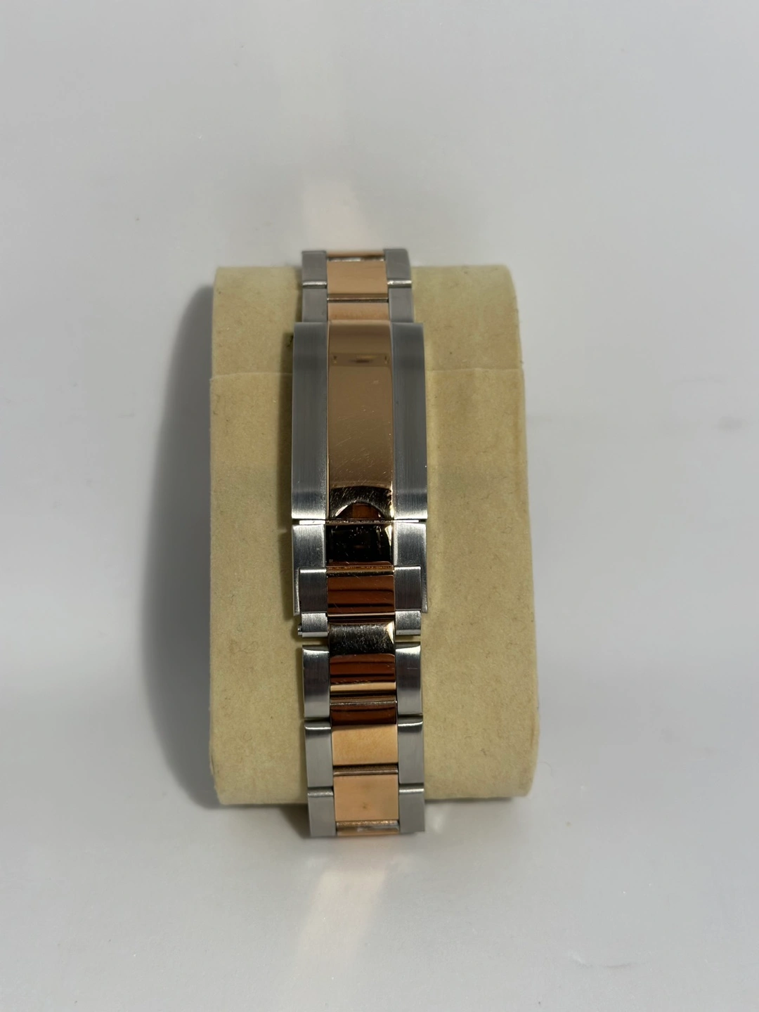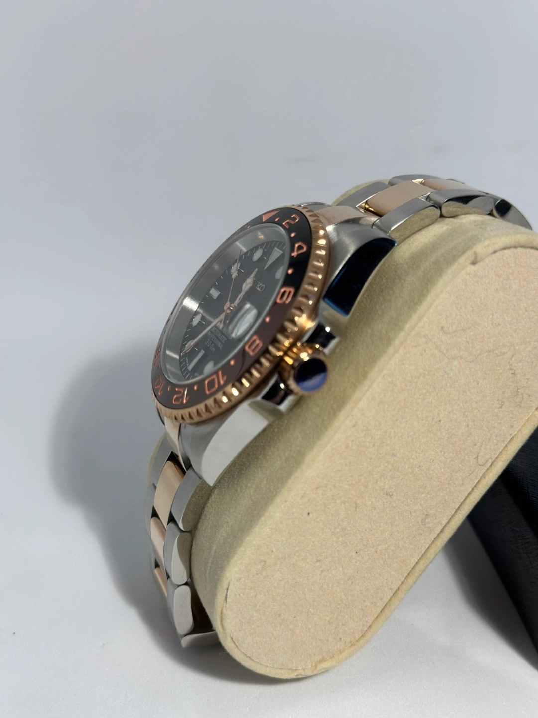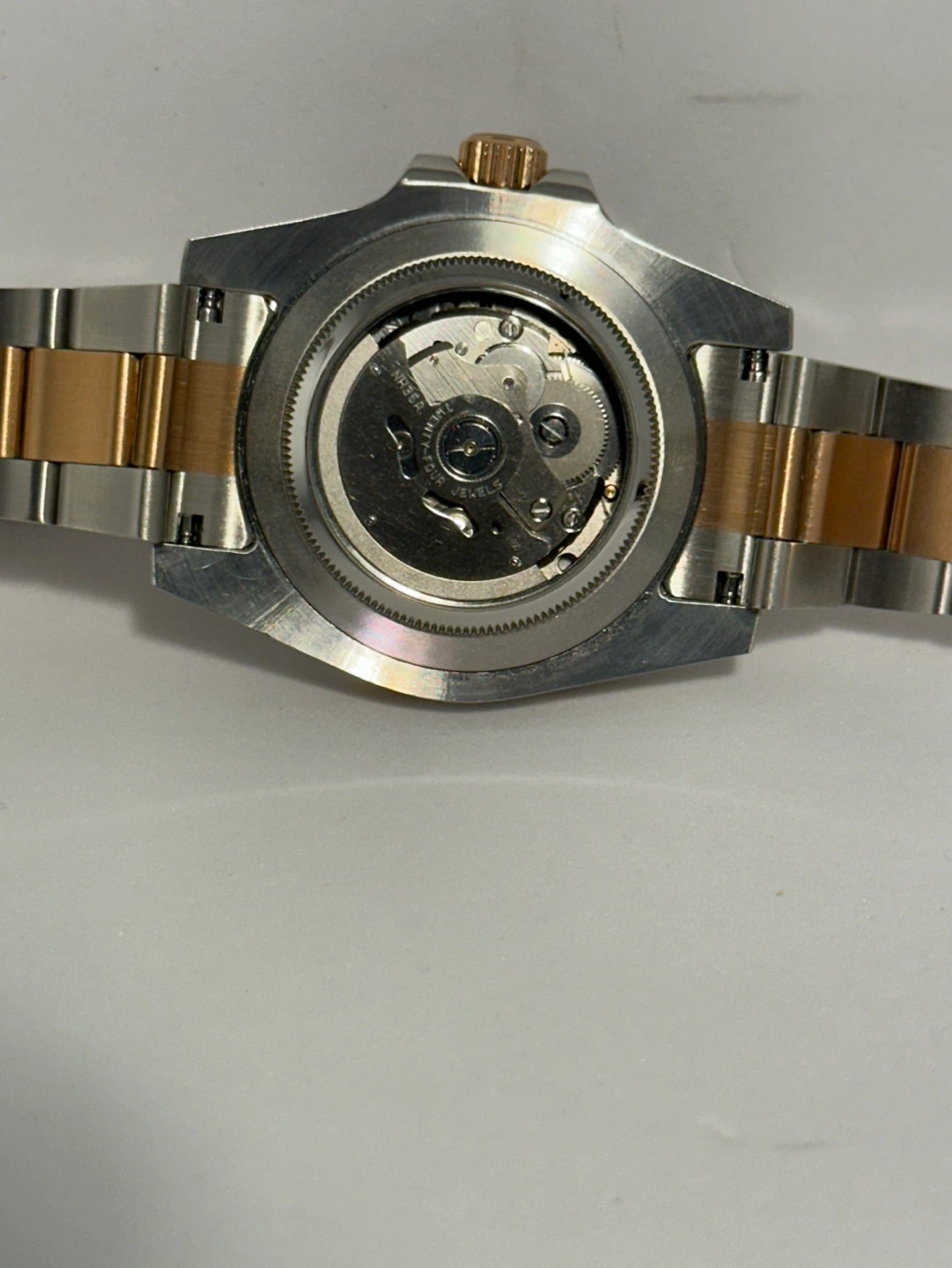 Two-tone stainless steel and rose gold band. Black face with rose gold accents. Automatic movement.