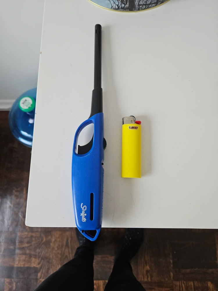 Blue long lighter never used Great for candles or fireplaces. The yellow lighter slightly used, but in good condition.