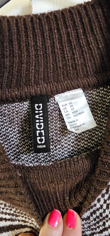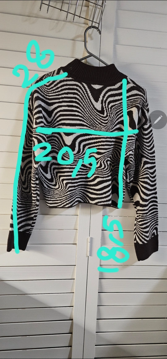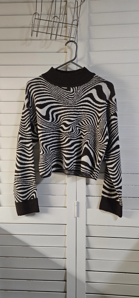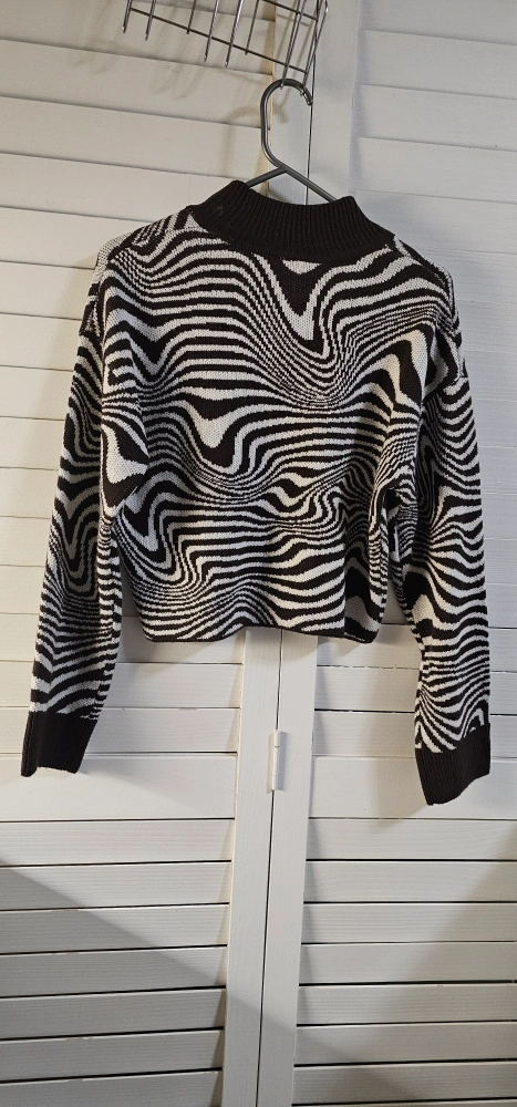 1000+Women's cropped mock neck sweater. Brown and white wavy pattern. Size XS. Measurements in image.
