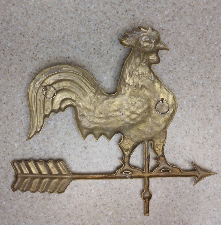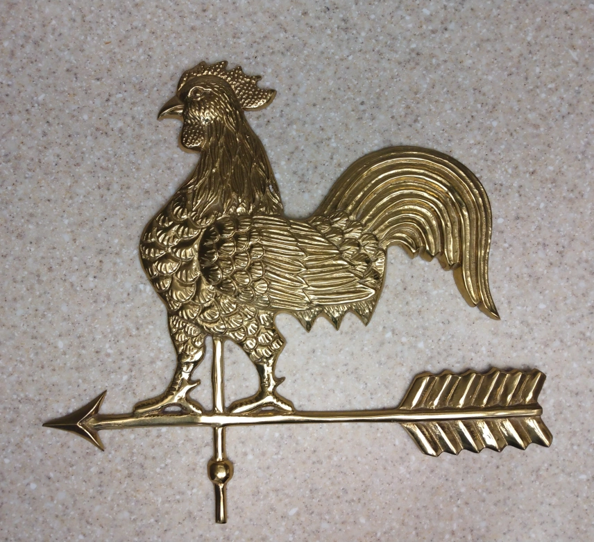 Brass rooster weather vane wall hanging measures approximately 13 1/2 inches high x 14 inches long (at the highest points). The tail part of the rooster is raised a bit but doesn't impact use as a wall hanging. Pick up in Mississauga or downtown Toronto (Union Station).
