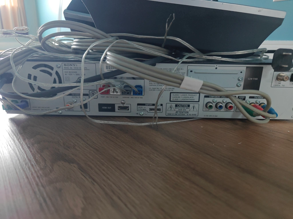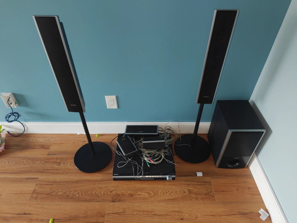 Home theatre system includes receiver, DVD player, two tower speakers, 2 rear speakers centre speaker, and subwoofer. Lots of cables included. Pre-owned.