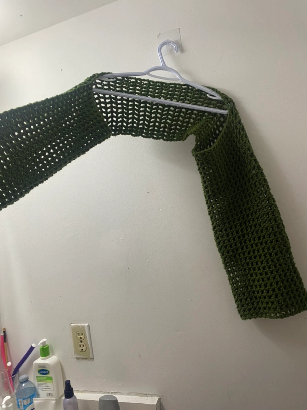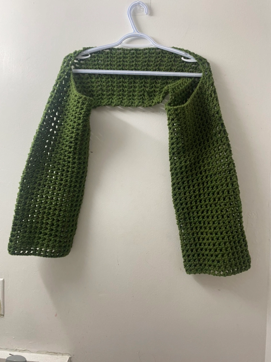 Hand-crocheted bolero. Olive green. Open front. Long sleeves. Lightweight. Perfect for layering and never used