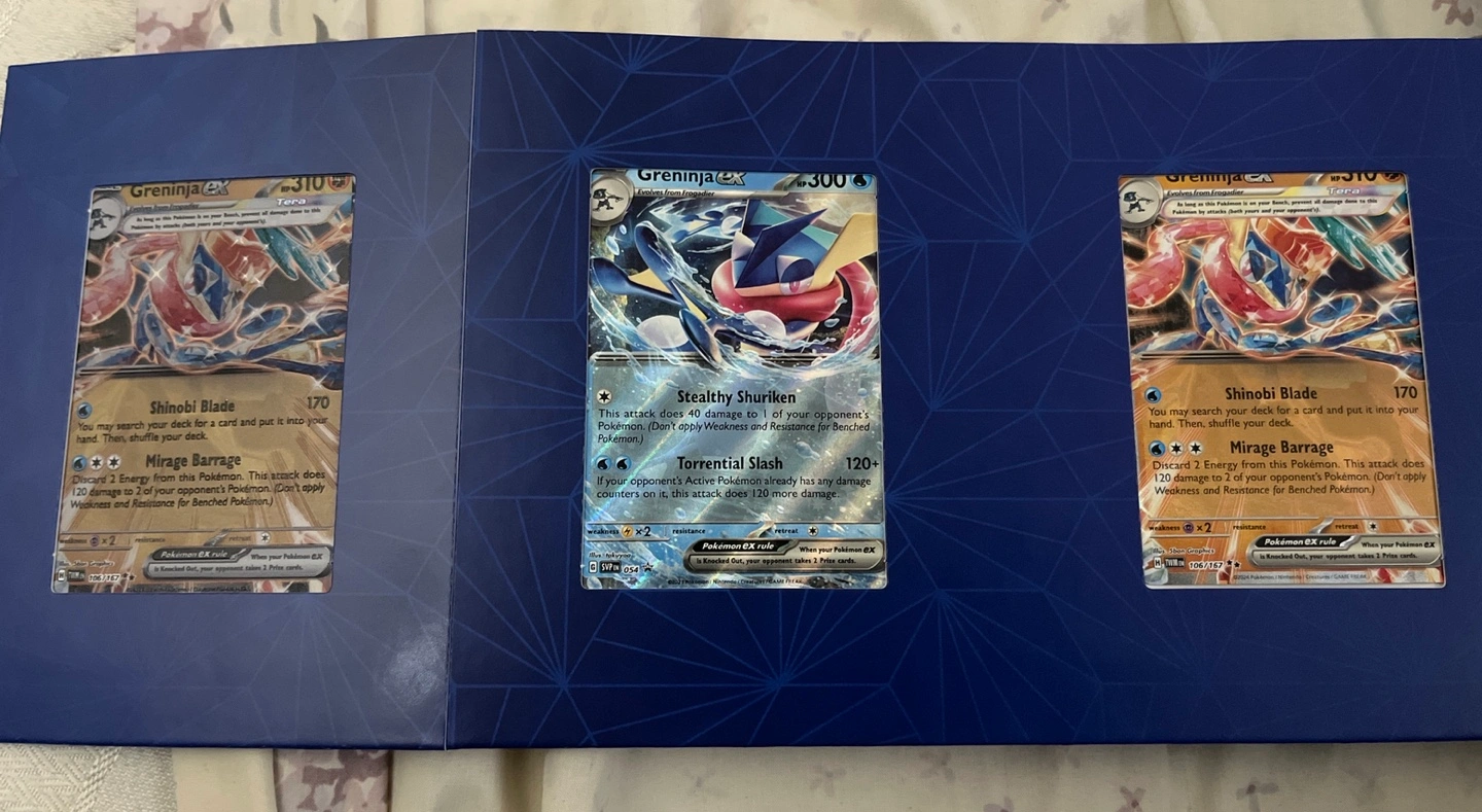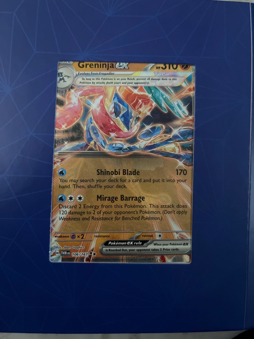 Rare Pokemon card. Features Greninja EX. Includes three attacks: Stealthy Shuriken, Torrential Slash, and Mirage Barrage. Excellent condition.