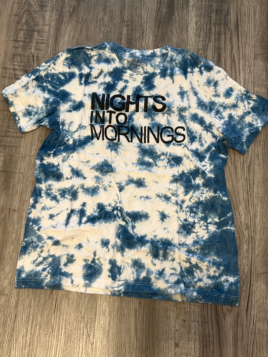 Short sleeve tie-dye t-shirt. Features a "Nights into Mornings" graphic. Relaxed fit. Size large