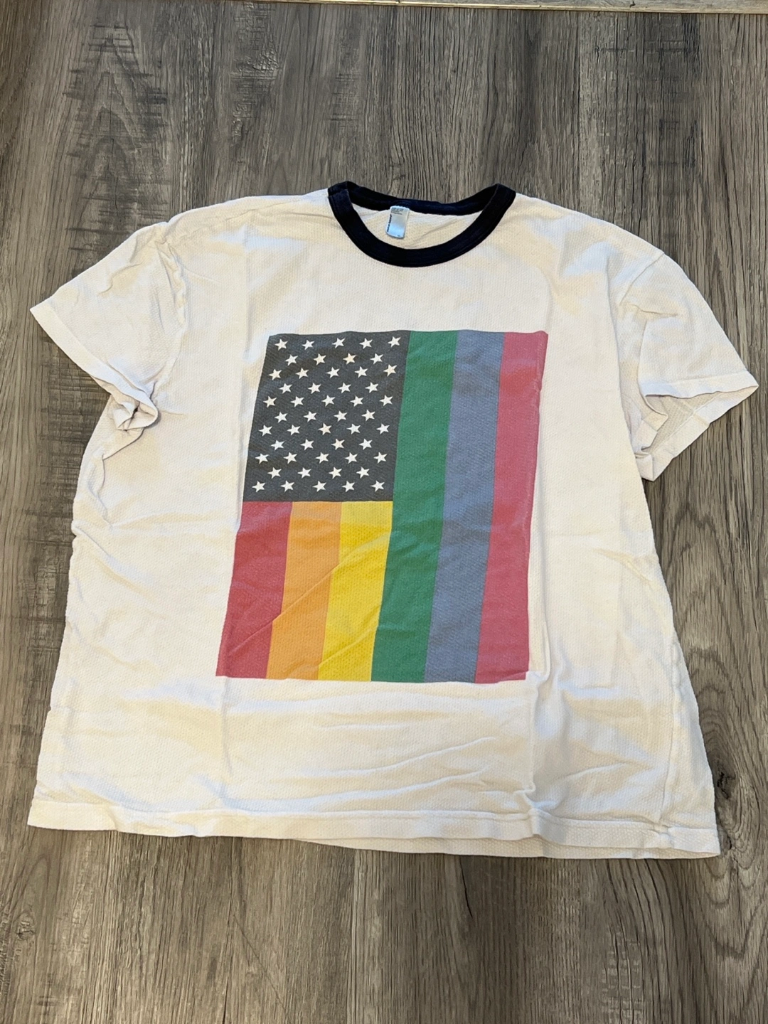 Cream-coloured t-shirt. Features a ringer neckline and a graphic of a rainbow-striped American flag. Short sleeves. Unisex sizing. Size is XL but fits like a large men’s