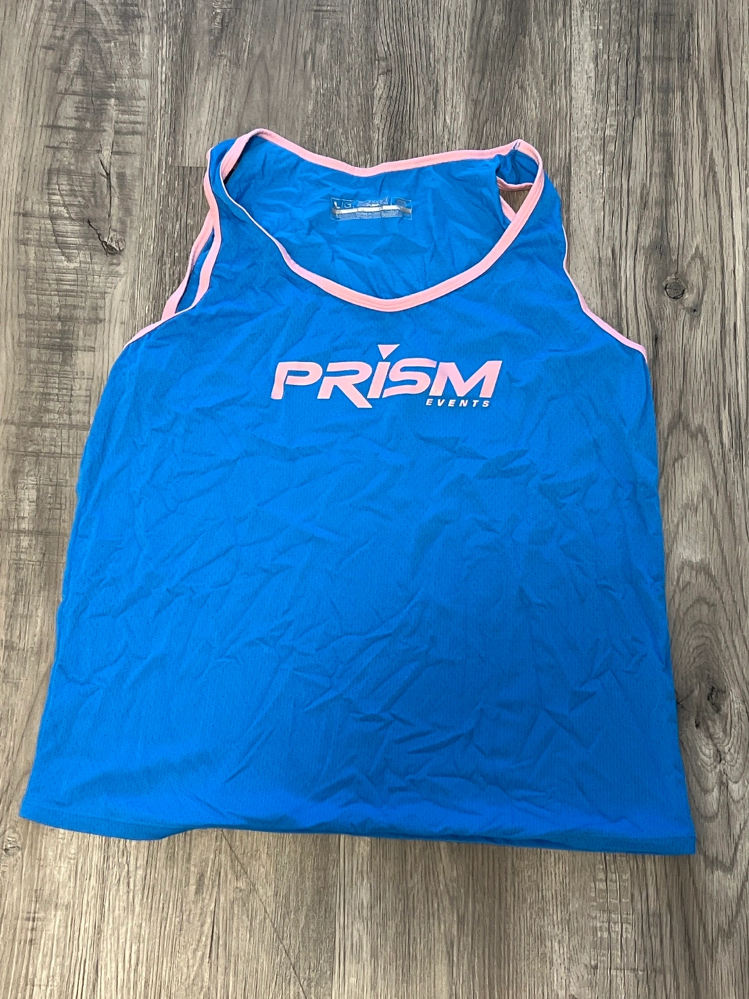 Lightweight blue racerback tank top. Pink trim. Prism Events logo. Great for running or working out. Size large