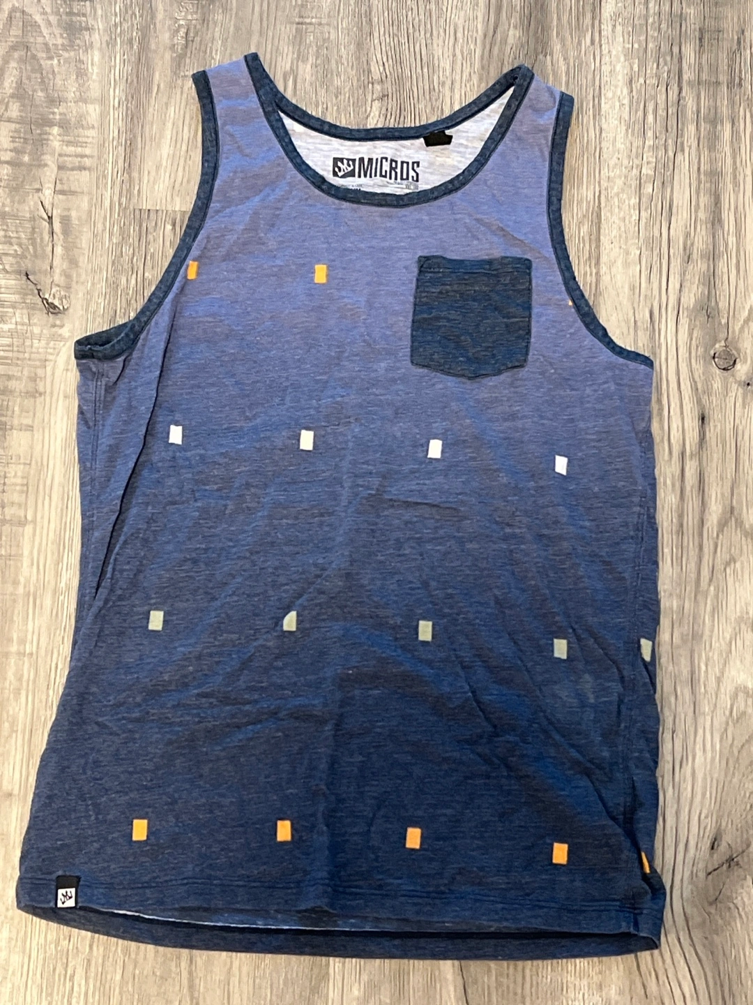 Blue ombre sleeveless shirt. Features small coloured squares and a front pocket. Good condition. Size medium