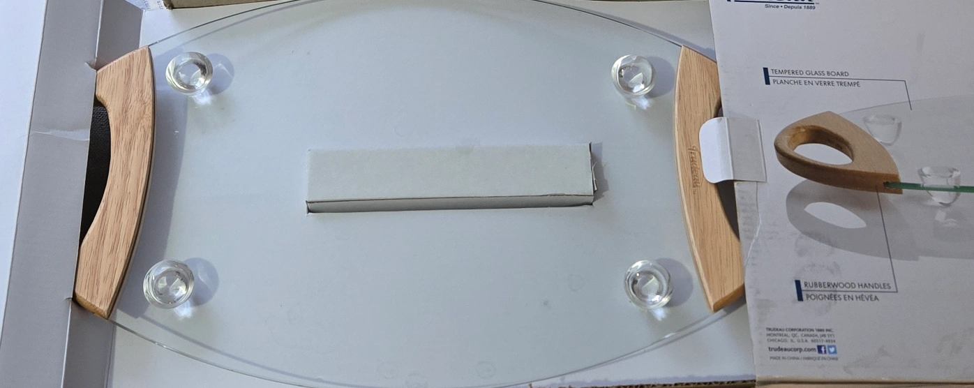 Oval-shaped tempered glass board. Features rubberwood handles. New in box.