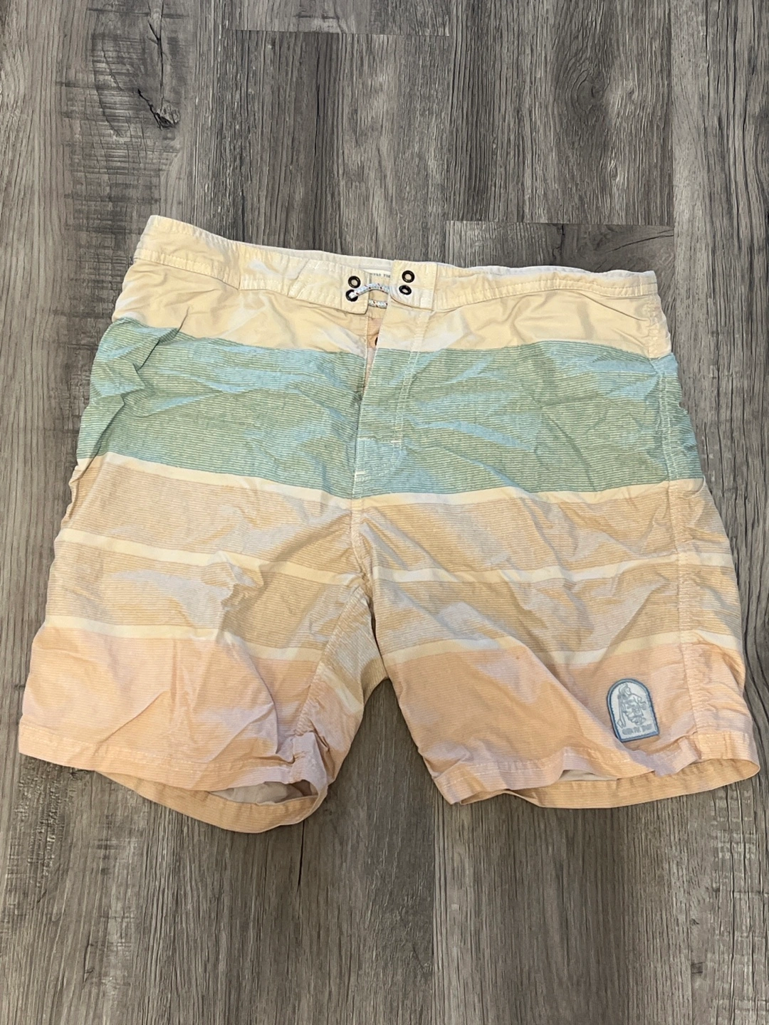 Pre-owned men's swim trunks. Horizontal stripes in beige, peach, and light teal. Drawstring closure. Small patch on one side. Size medium