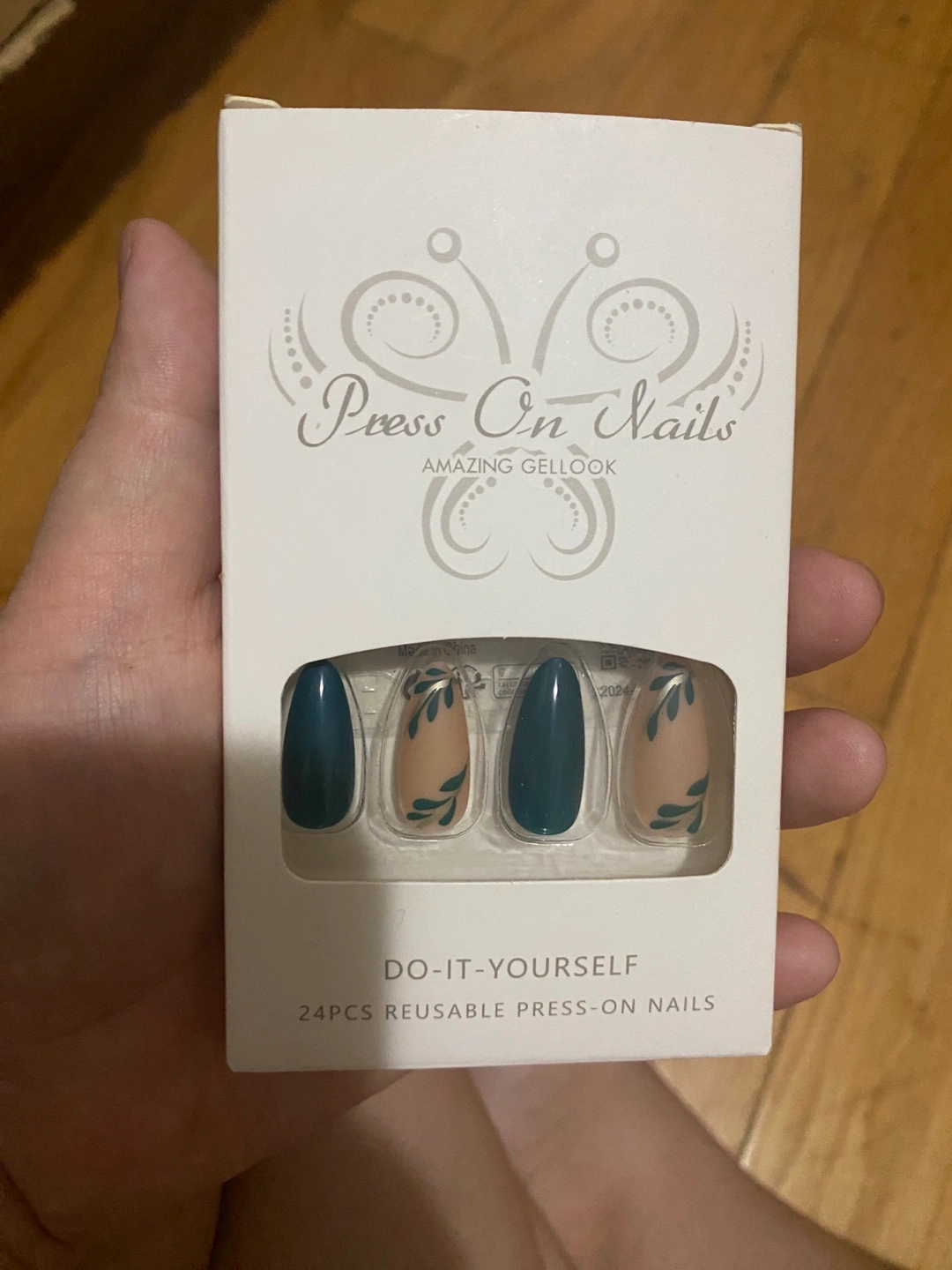 Amazing Gelllook brand press-on nails. Do-it-yourself application. 12 reusable nails included. Teal and beige colour scheme with floral accents. Perfect for a manicure.