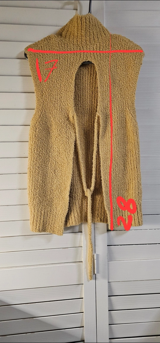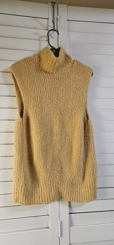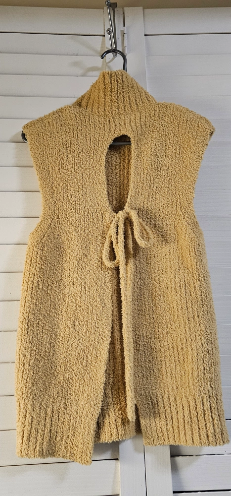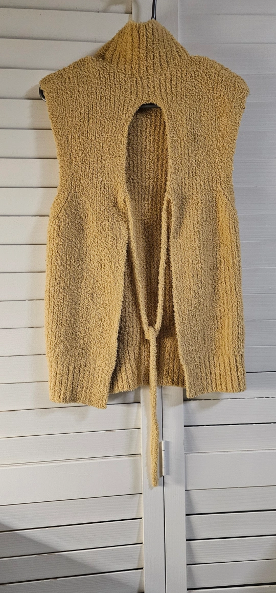Mustard yellow sleeveless knit top. Mock neck. Open back with self-tie detail. Cozy and warm. Size. measurements on pick
