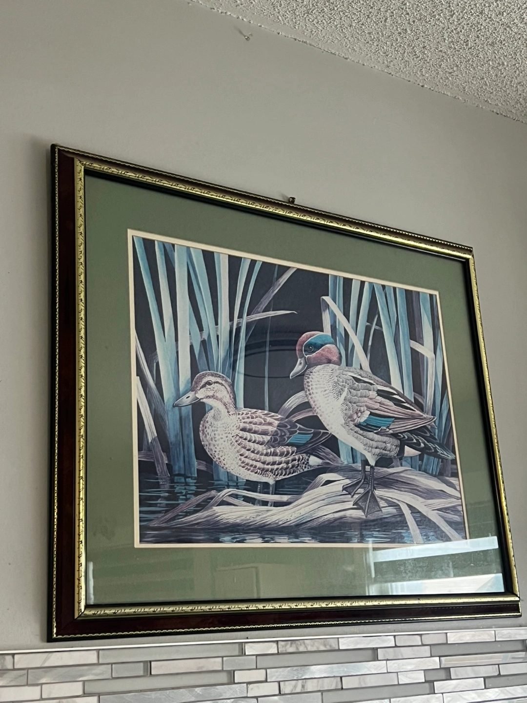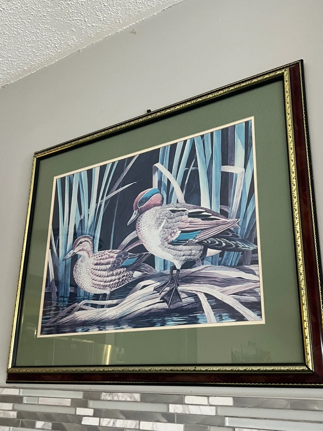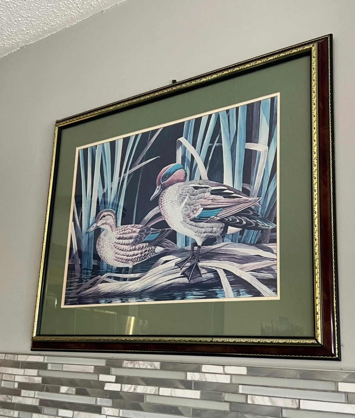 Beautiful framed print of two teal ducks. Dark background, reeds, and water. Dark wood frame with gold detailing. Ready to hang.