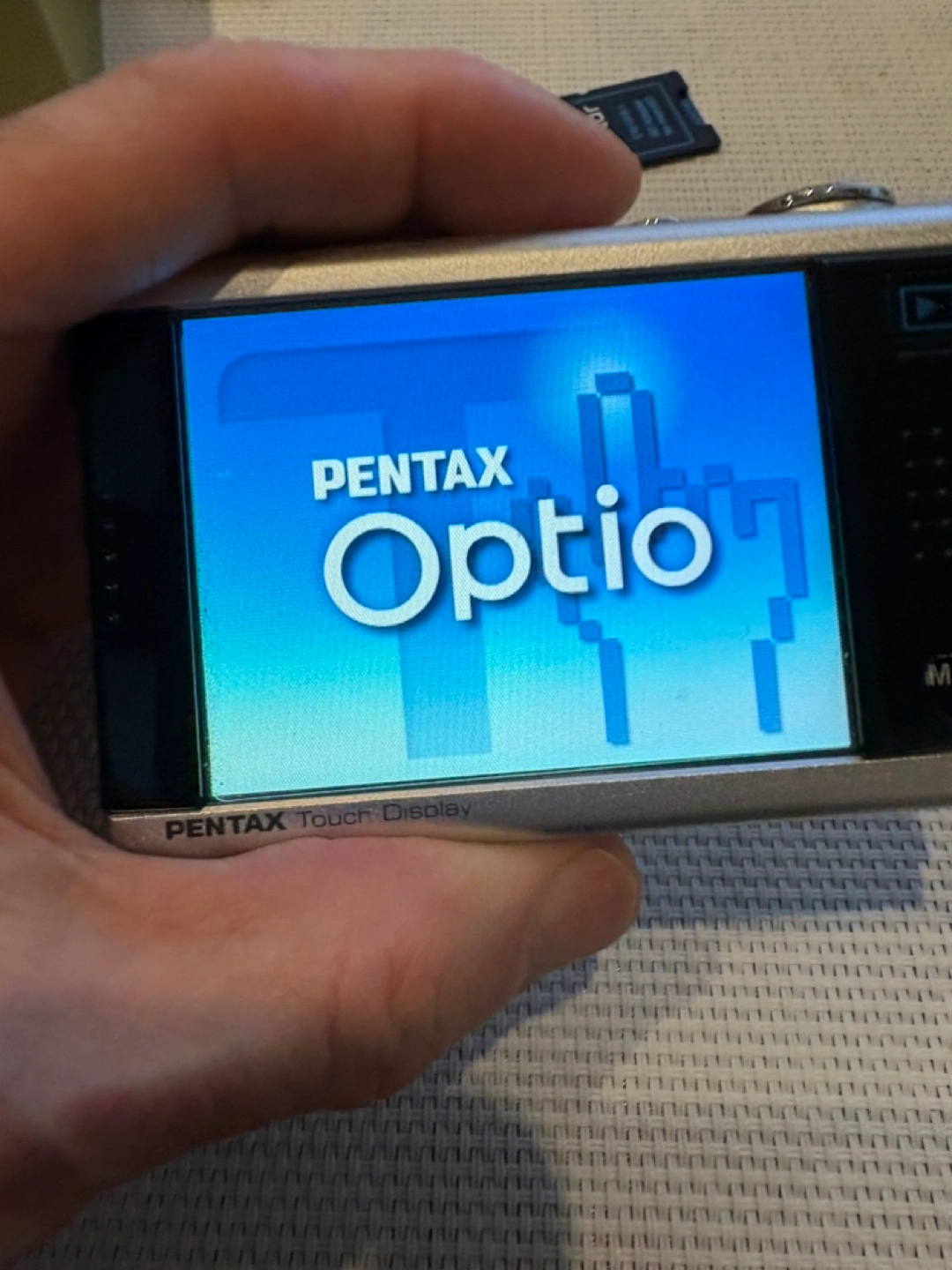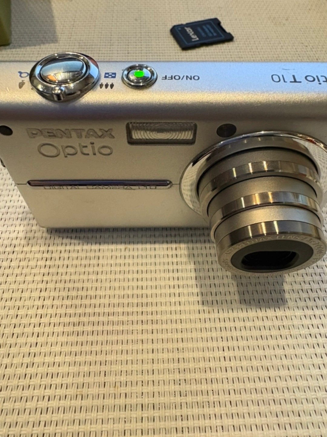 PENTAX Optio T10 digital camera. Silver colour. Features a touch screen. SD card slot.