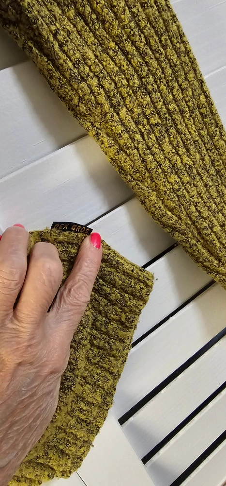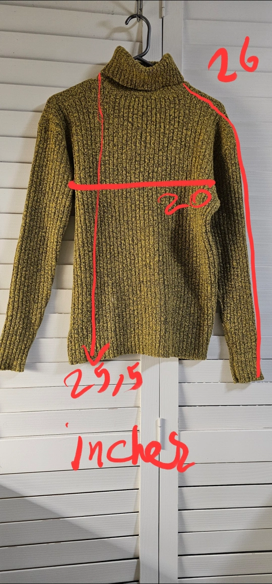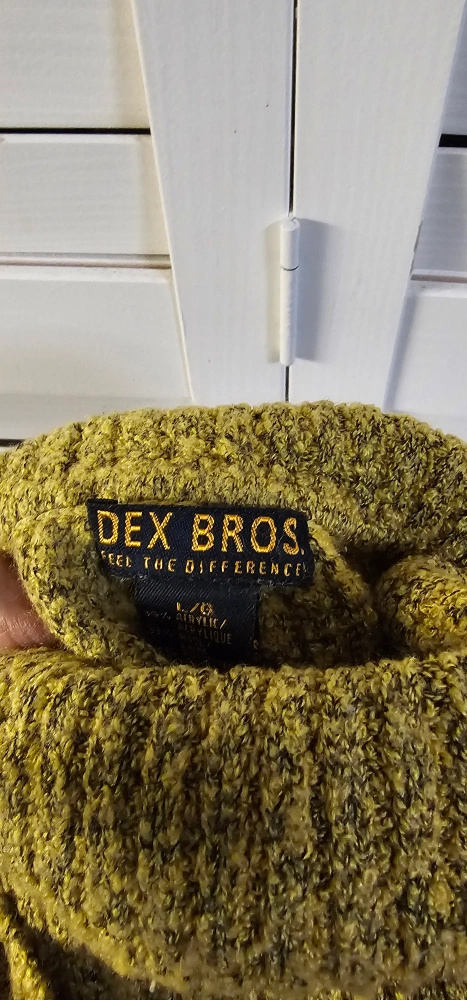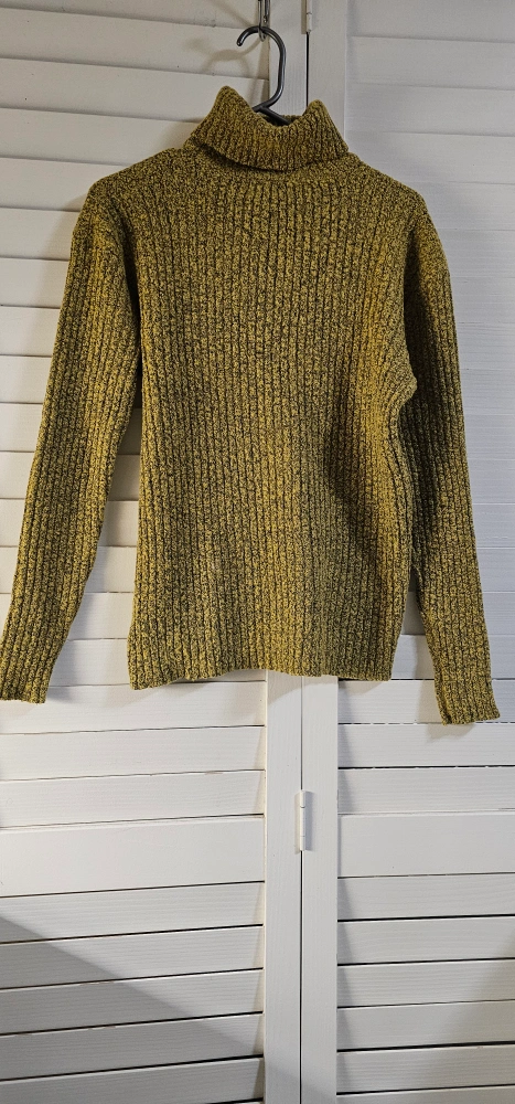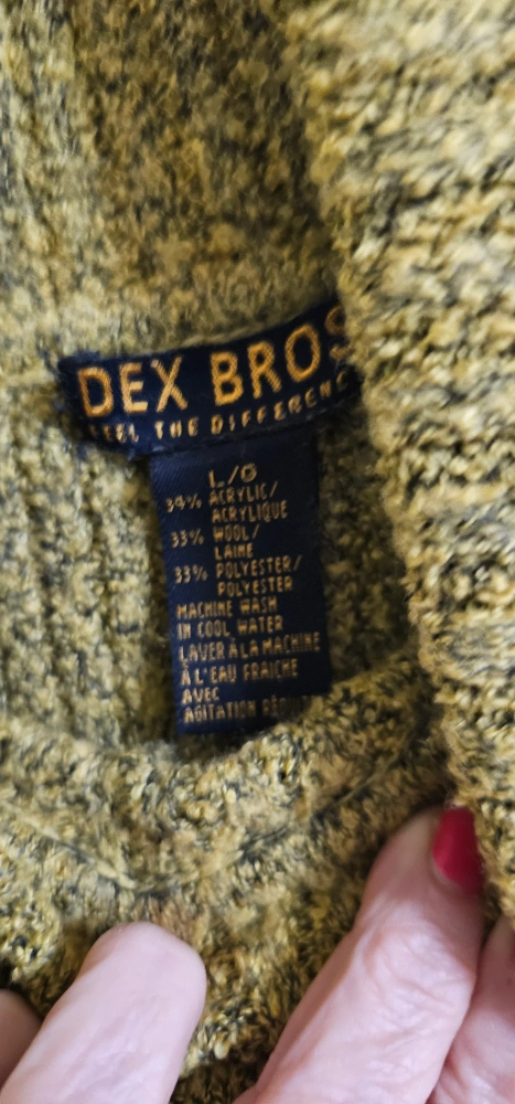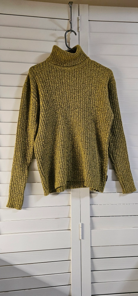 Women's size large/grande Dex Bros. turtleneck sweater. Mustard yellow with a ribbed texture. Long sleeves. Soft and cozy. Machine washable.