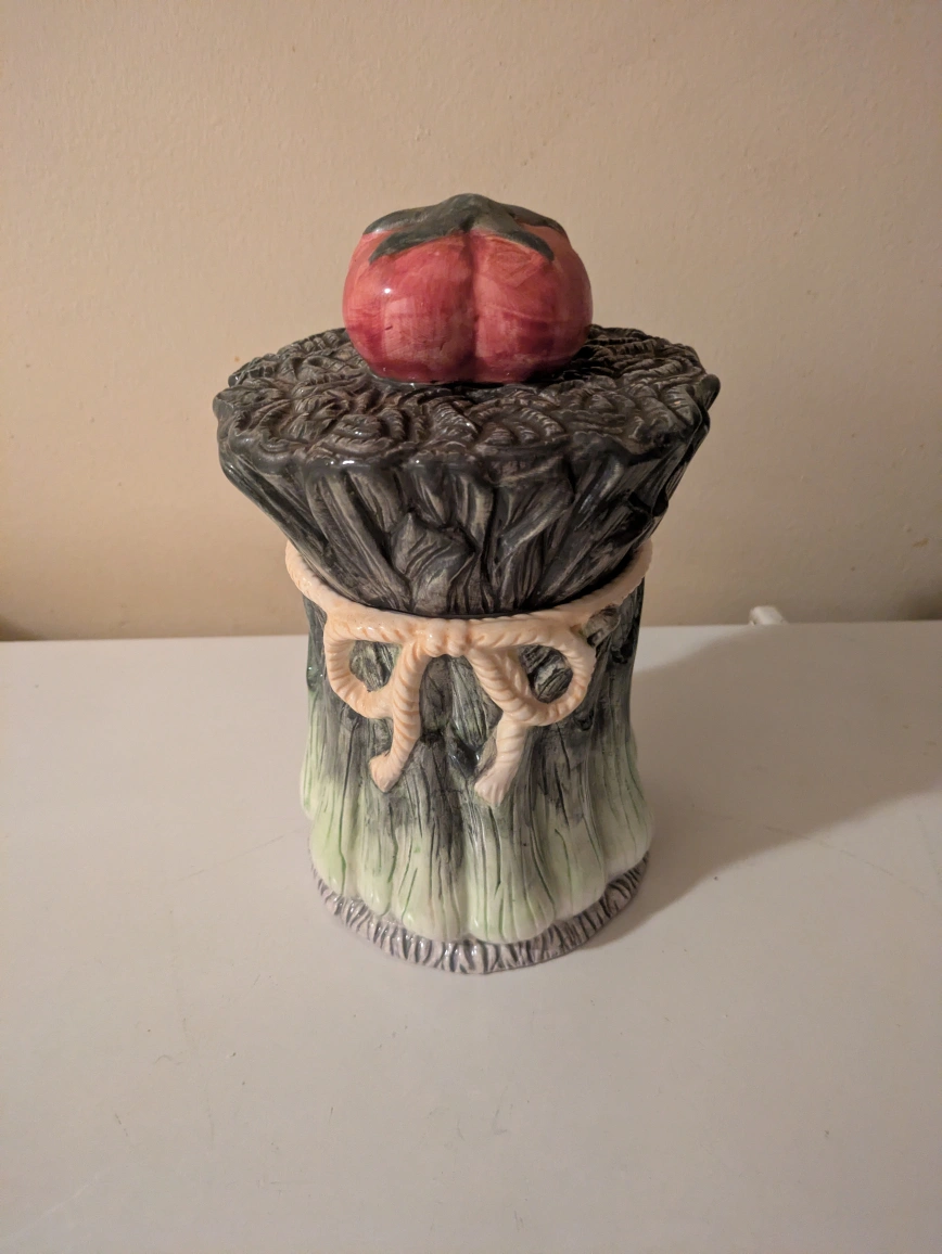 Adorable 1970s vintage hand painted ceramic cookie jar. Features a tomato on top of a bundle of asparagus. Hand-painted and hand-decorated. Unique and charming addition to any kitchen. Serious inquiries only. Quick reply.