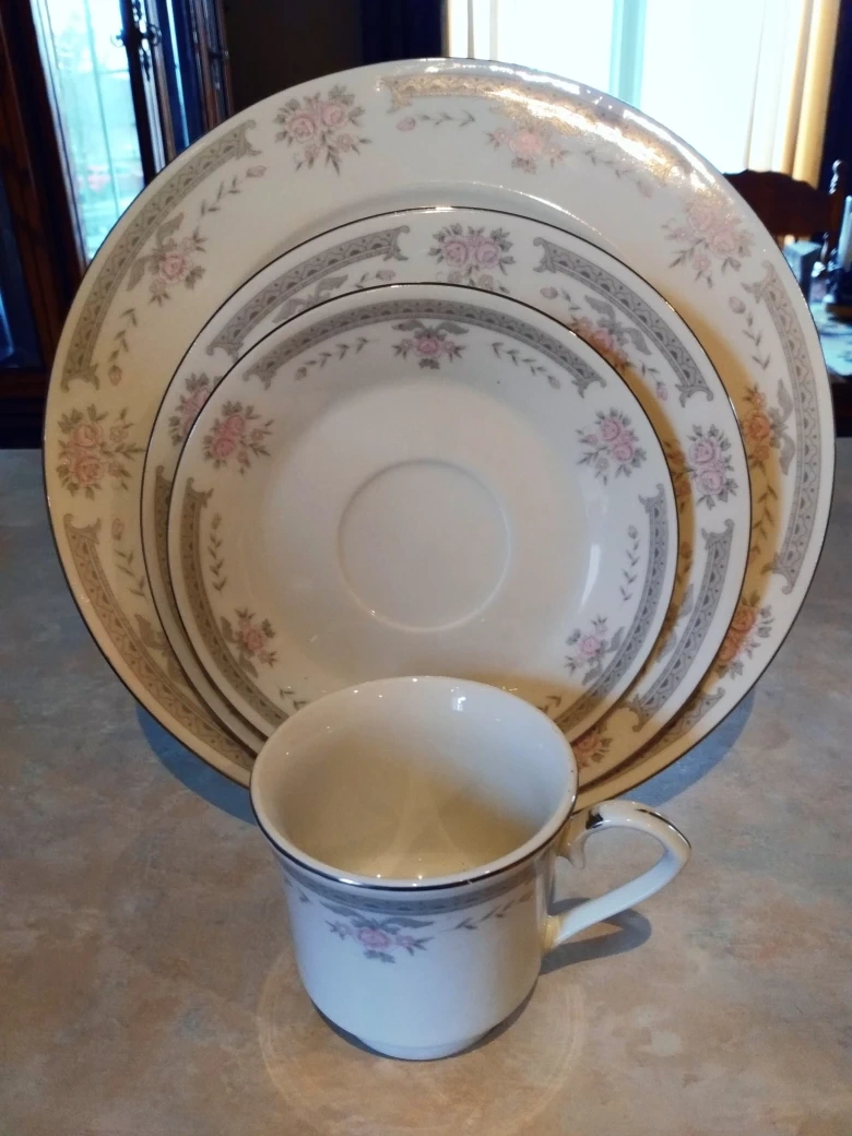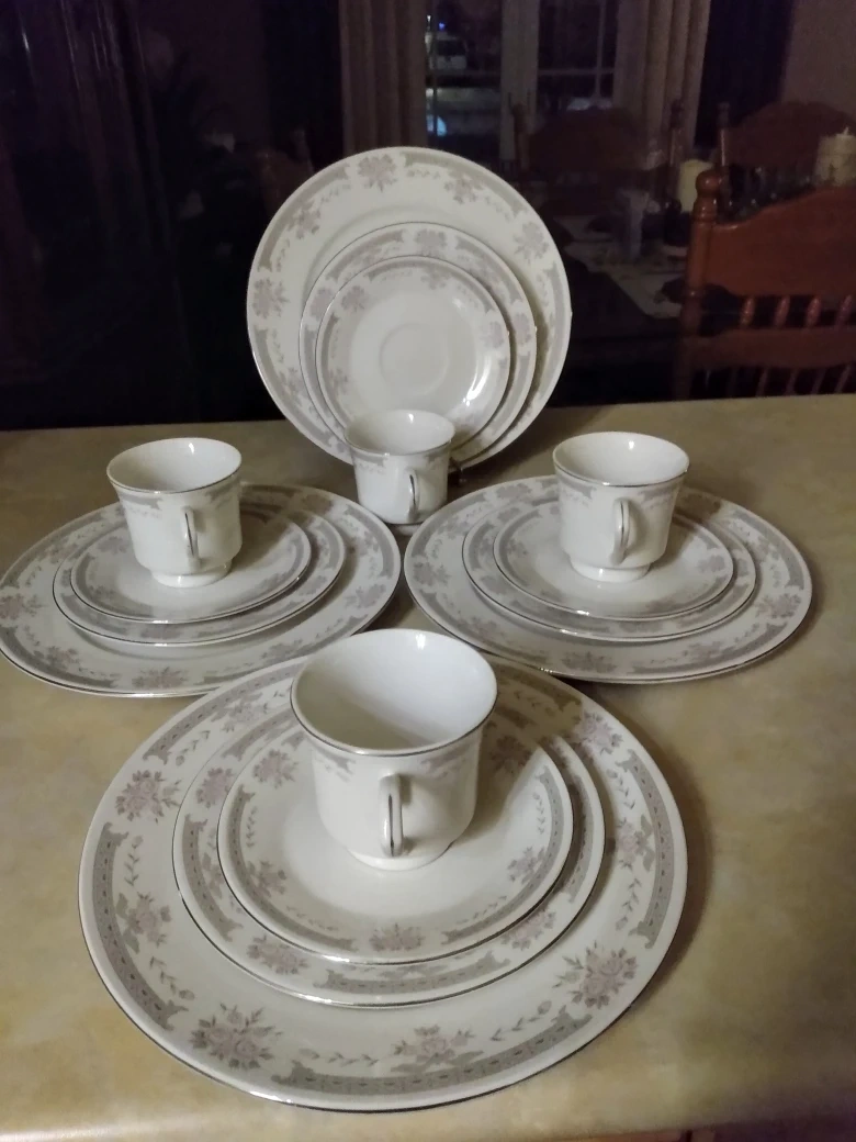 Beautiful 4 Sets of Fine China plate sets Includes cups, saucers, plates. Subtle floral design. Silver trim accents. Perfect for every day use. (Cash pick up)