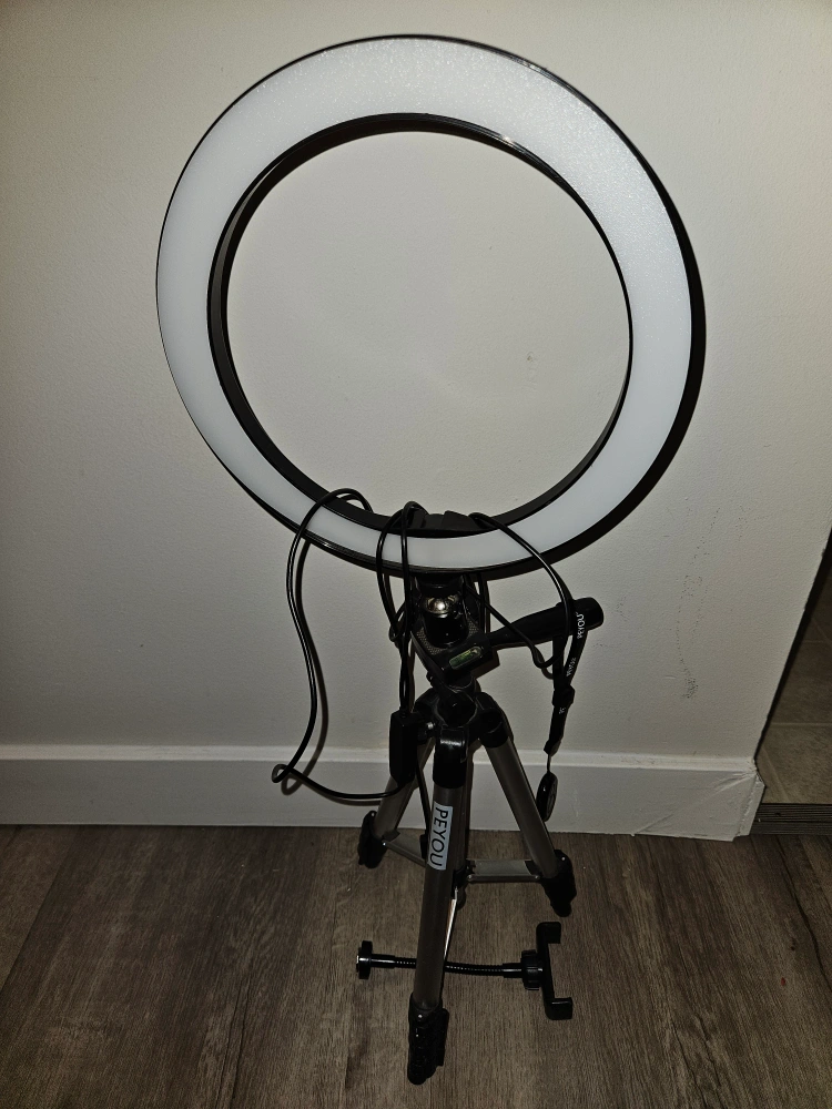 Portable ring light. Includes tripod and phone holder. Great for selfies and videos.