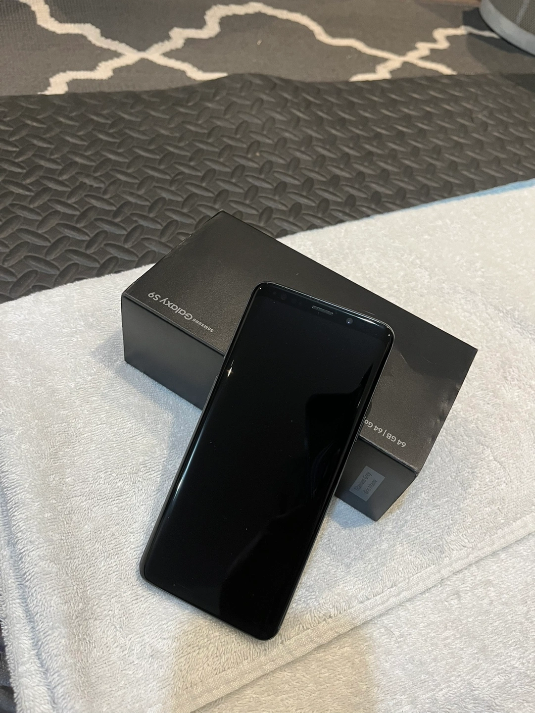 New in box. Unlocked Samsung Galaxy S9 smartphone. Midnight Black colour. Includes original brand new charger, USB cable, and earphones. Pick up only.